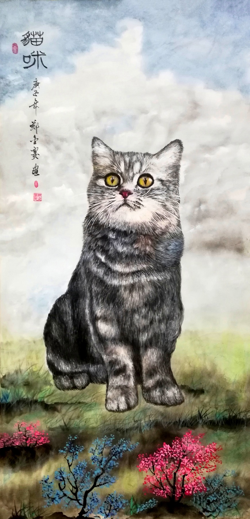 丹青精工,大家传承。郑先生创作人物画,贵能传神,可有点精之法。因为形态塑造得相当逼真,所以可以透过形式的完美,透见人物的内心世界。贤圣入画读春秋,传统文人的形象与神态跃然纸上,令人忘怀。这就是他有工笔线条可以传人物之神,显丹青之工的上乘功夫。当然,郑金赛先生在花鸟之下画猫趣,已经成为他师古而不泥古,可以创建自己的丹青领地的见证!其工笔作毛皮动物小猫,如真如实,惟妙惟肖。挂一件这样的作品在厅堂,满屋生趣意,体现着丹青艺术极致的审美魅力。齐白石画虾,郑板桥画竹,郑金赛画猫!丹青大家,除了有共性的艺术创作能力之外,必然也会像郑先生这样,独有一题风范,可作春秋佳谈!