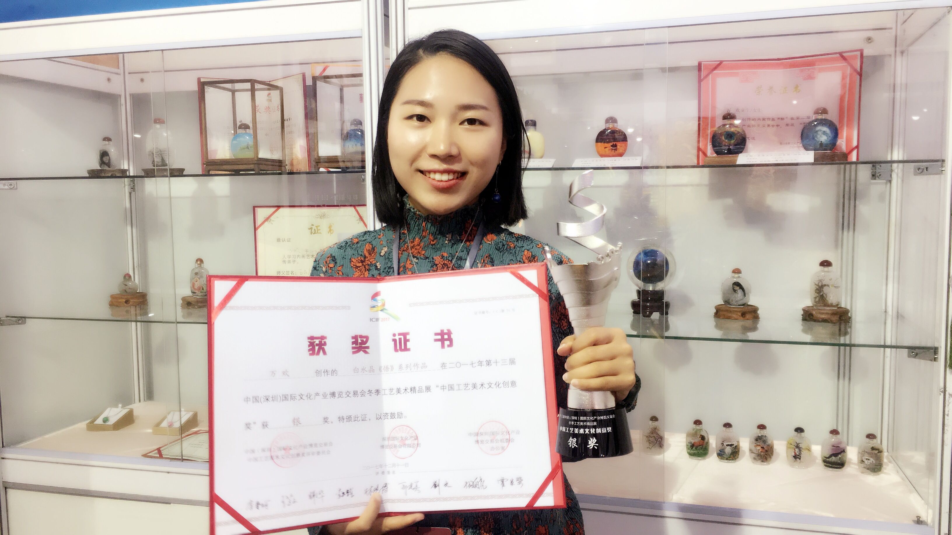 2017年12月11日,万欢创作的内画鼻烟壶作品《悟》系列获得冬季文博会中国工艺美术文化创意奖银奖;