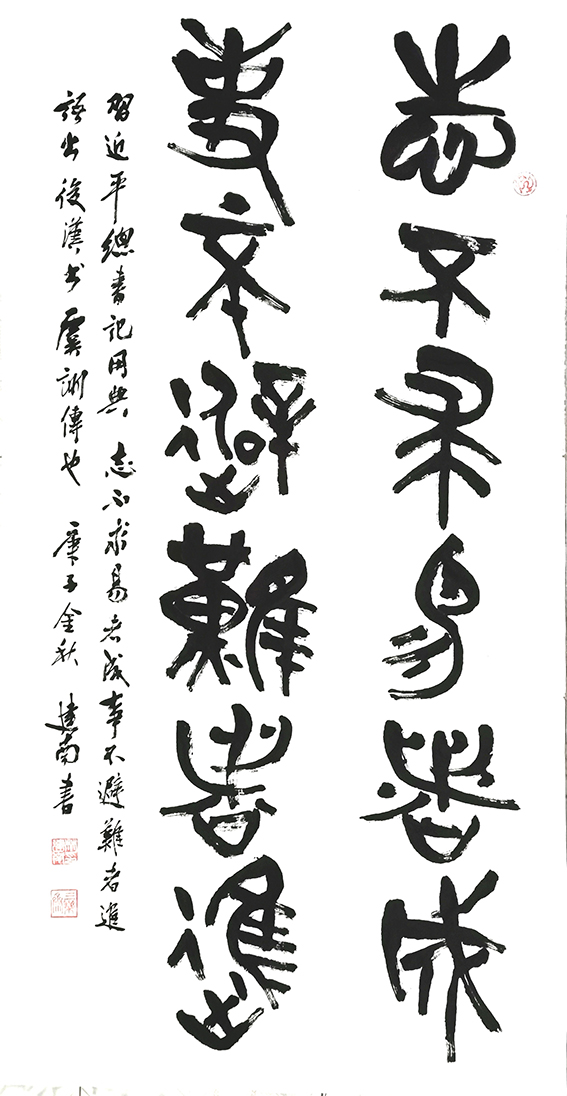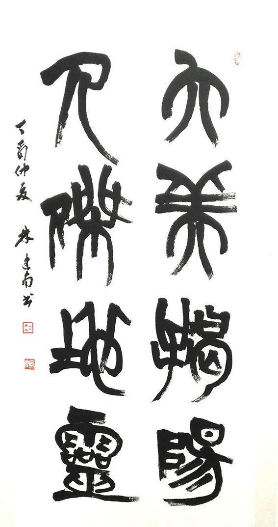 林建南长期陶醉于诗文书画。特别喜爱古文字书法,擅长用篆书、魏碑创作榜书作品,上追先秦汉魏,下融时代精神,重拙与灵动结合,雄浑与法度相谐,汲古求新,沉雄豪爽。篆刻宗汉印,汲取金文及石刻文字特点,爽利劲健。国画尤喜传统山水,2017年7月参加"凹斋门下一一揭阳中国画高研班"学习,重视传承,注重文气,师法自然,贴近时代。