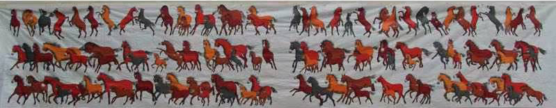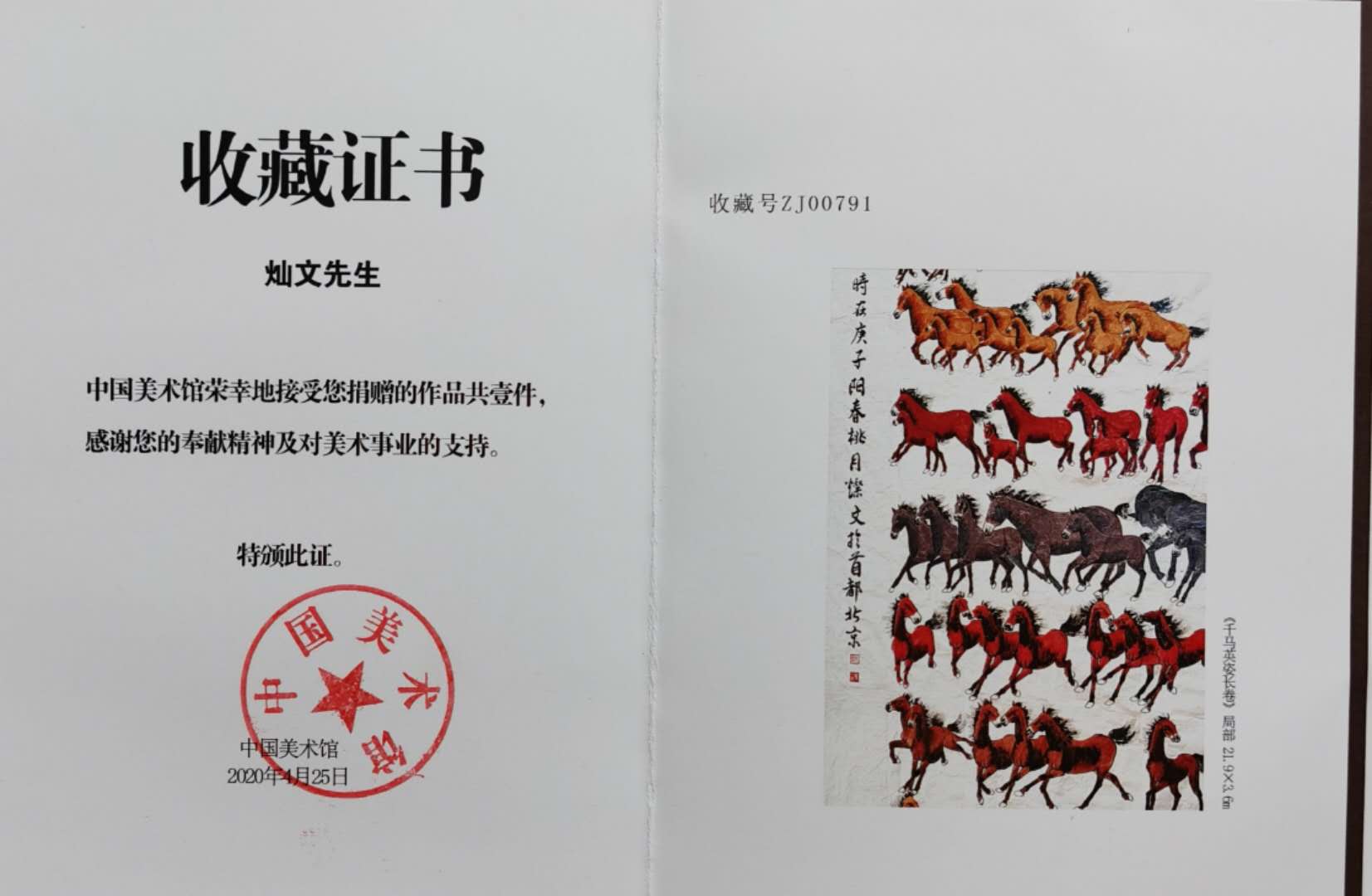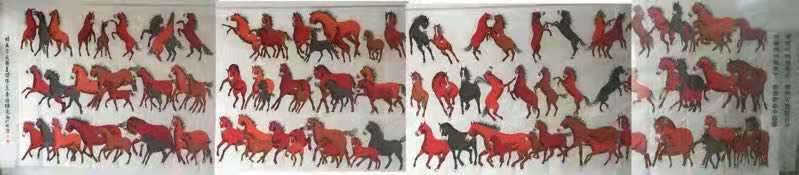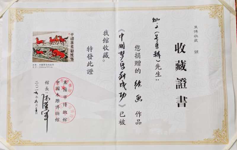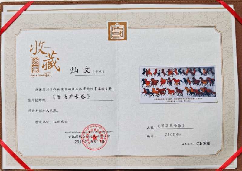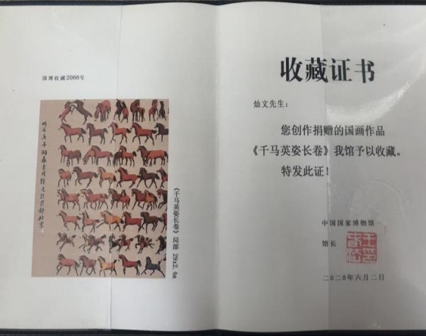 千马英姿长卷被中国美术馆收藏,收藏证号,zj00791号。千马英姿长卷被中国国家博物馆收藏,收藏证号,国博收藏2066号。