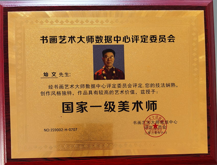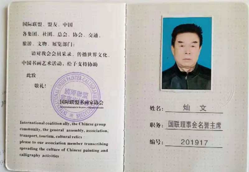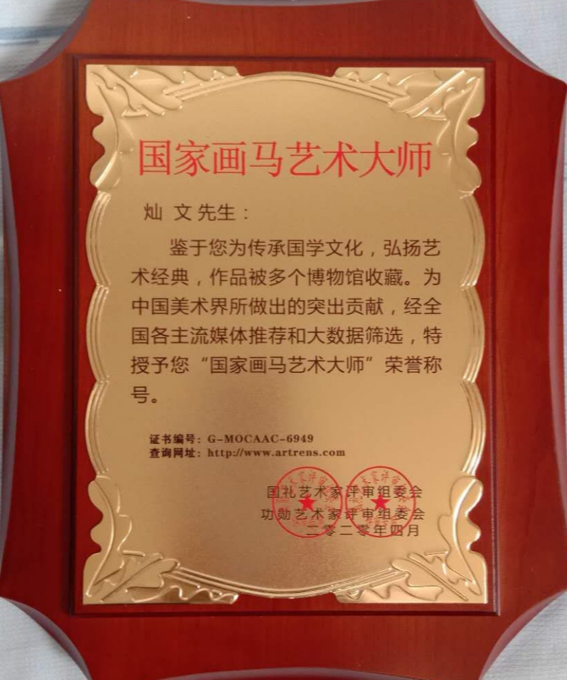 灿文,号马赫,中国人民艺术网客座教授,翰墨国艺文化研究院副院长,国际联盟书画家协会名誉主席,2020年全国雷锋式人物称号。