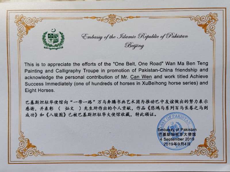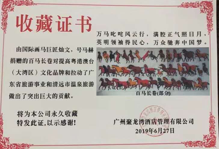 193匹马长卷被联合国开发署收藏并荣获世界和平绘画艺术贡献奖,100匹马长卷被徐悲鸿纪念馆收藏,悲鸿系列百马长卷中国梦马到成功及8马画被巴基斯坦驻华大使馆收藏,中英建交书画大展在剑桥大学由剑桥市长颁发了中英友好亲善大使证书和大国工匠证书。100匹马长卷被四川甘孜藏族自治州民族博物馆收藏,100匹马长卷被浙江省东阳市博物馆,国家木雕博物馆收藏。100匹马长卷被江西省上饶市博物馆收藏。108马长卷被正威集团收藏。100马长卷被广东省清远市东新温泉开发有限公司收藏。18马画被广州白云国际机场贵宾厅收藏。在一带一路万马奔腾书画大展中荣获万马奔腾奖。获十大红色艺术大师称号,现有多卷百马长卷问世,同时用8年时间完成了8卷千马长卷,2年后再完成2卷千马长卷,将万马奔腾的口号变成现实。千马千姿千态,奔腾和谐各显英姿,有些突显龙马精神,形态各异,栩栩如生,精神抖擞,斗志昂扬,意气风发,令人震撼;有的突显和谐,富贵吉祥,温顺优雅,给人眼前一亮的感觉。