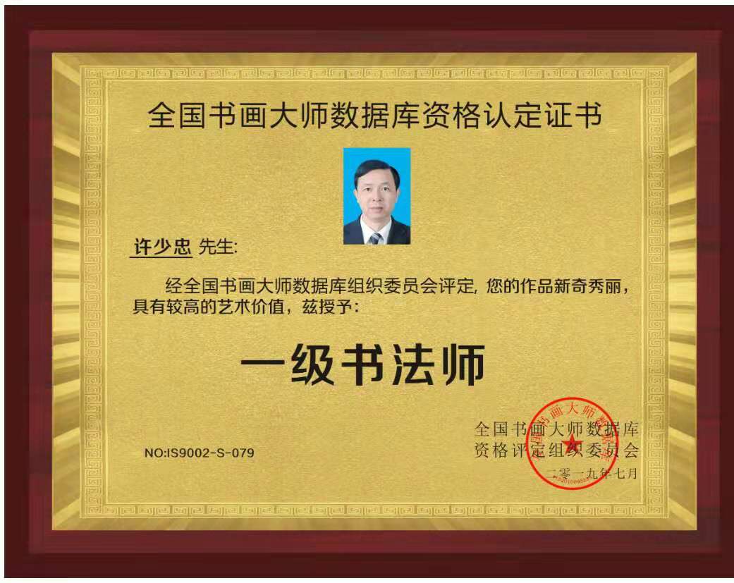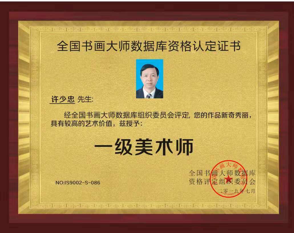 2019年7月,被全国书画大师数据库资格评定组织委员会评为国家一级美术师、一级书法师。