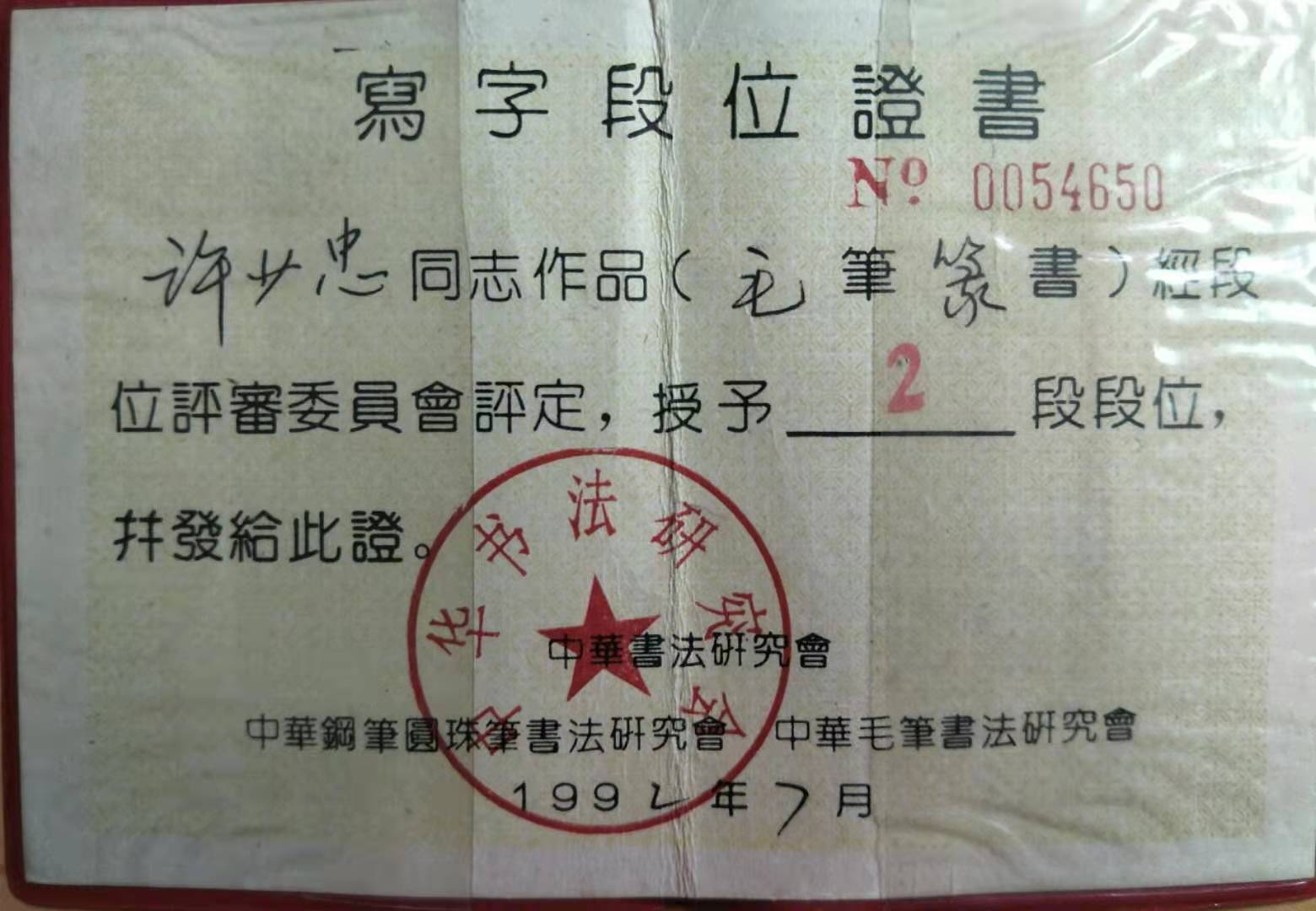 1992年6月,参加全国书法大赛,取得奖励,荣获被中华书法研究会、中华钢笔圆珠笔书法研究会、中华毛笔书法研究会授予毛笔2段段位称号;