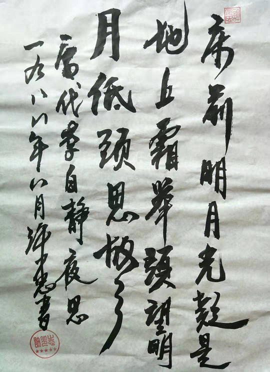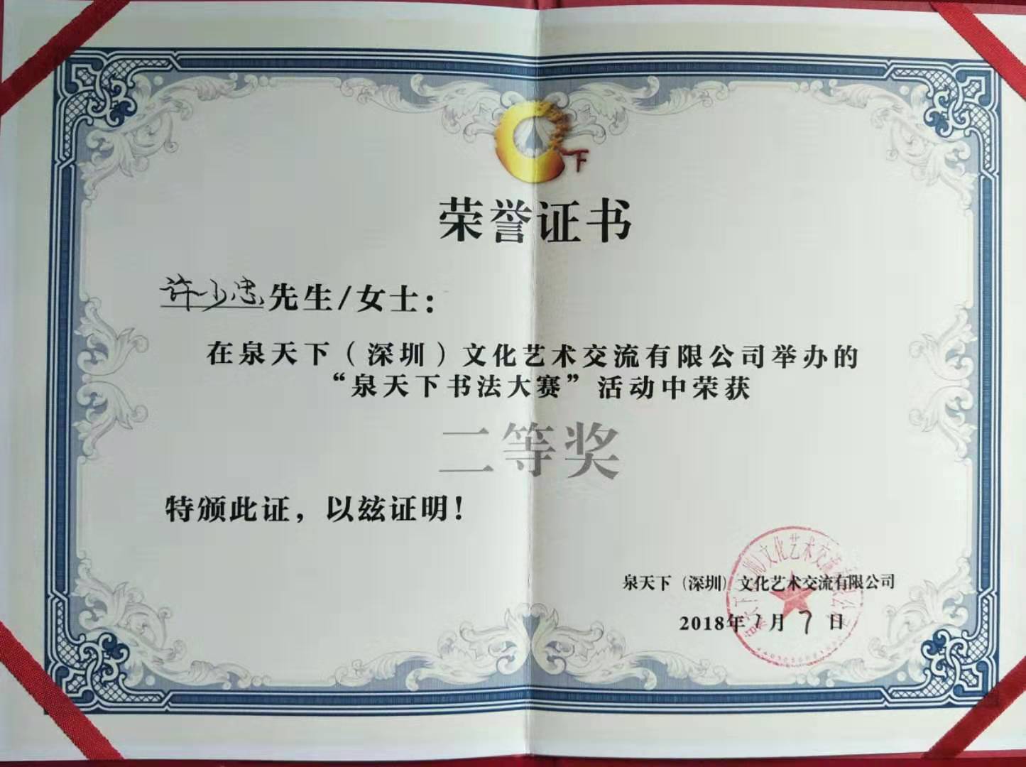 2017年12月,参加深圳泉天下文化公司书法大赛, 荣获二等奖,并聘任为泉天下(深圳)文化公司著名书法家等。