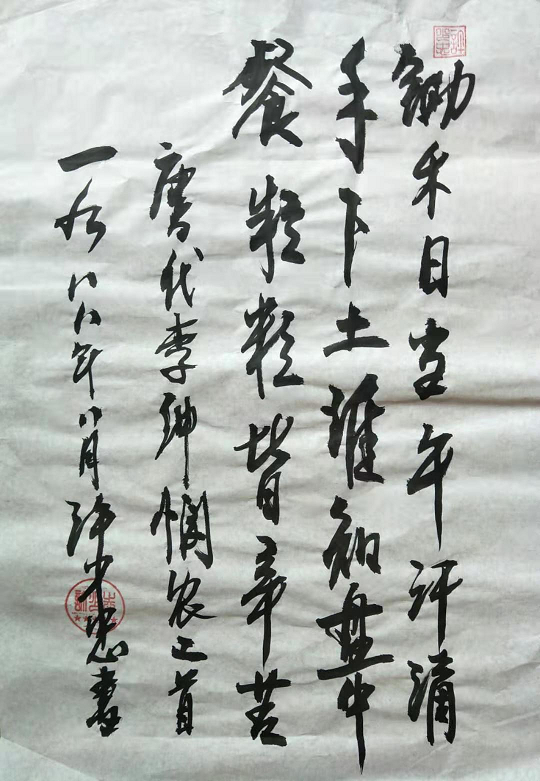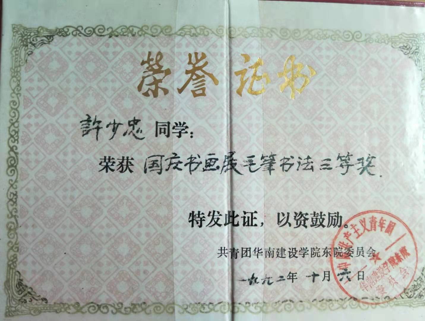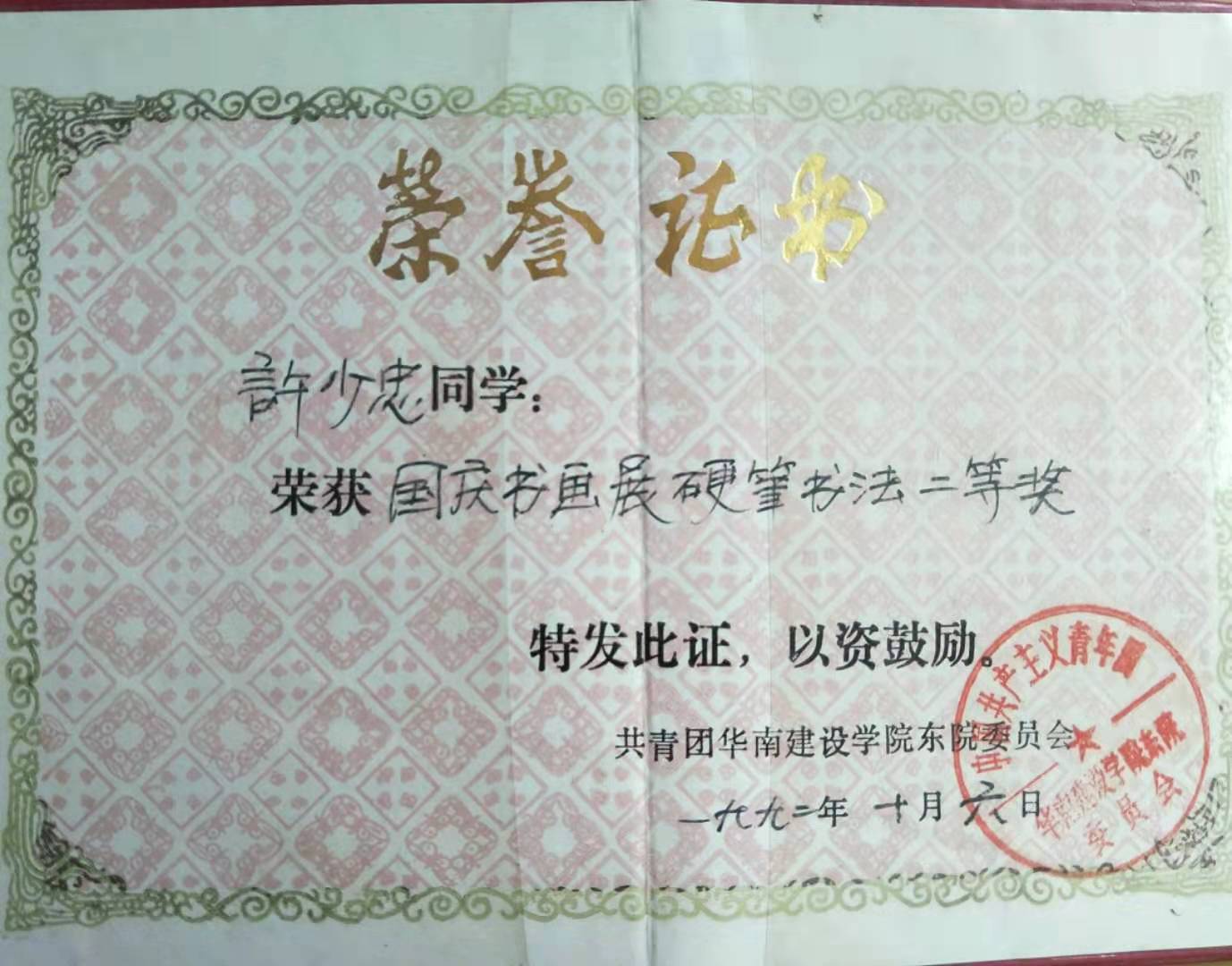 1992年10月,参加华南建设学院东院国庆书画展览比赛, 荣获毛笔三等奖和硬笔二等奖;