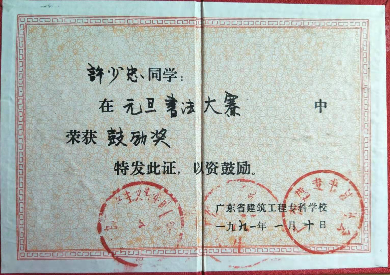 1990年12月,参加广东建专元旦书画展览,受到奖励,荣获鼓励奖;
