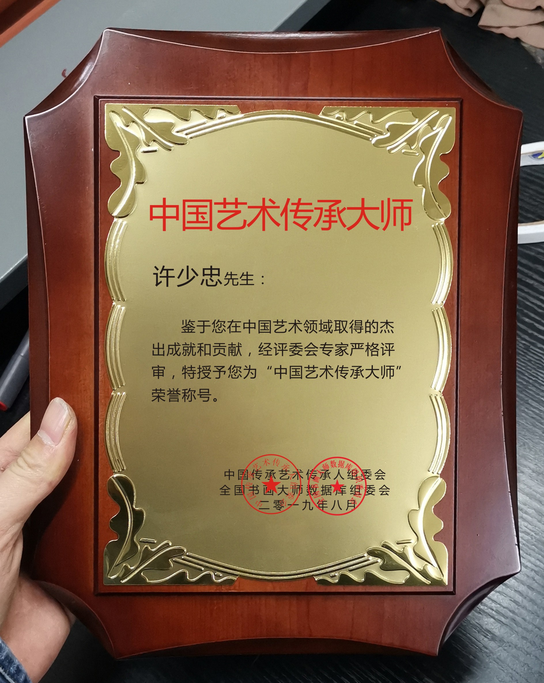 2019年8月,经中国传承艺术传承人组委会评定为中国艺术传承大师。