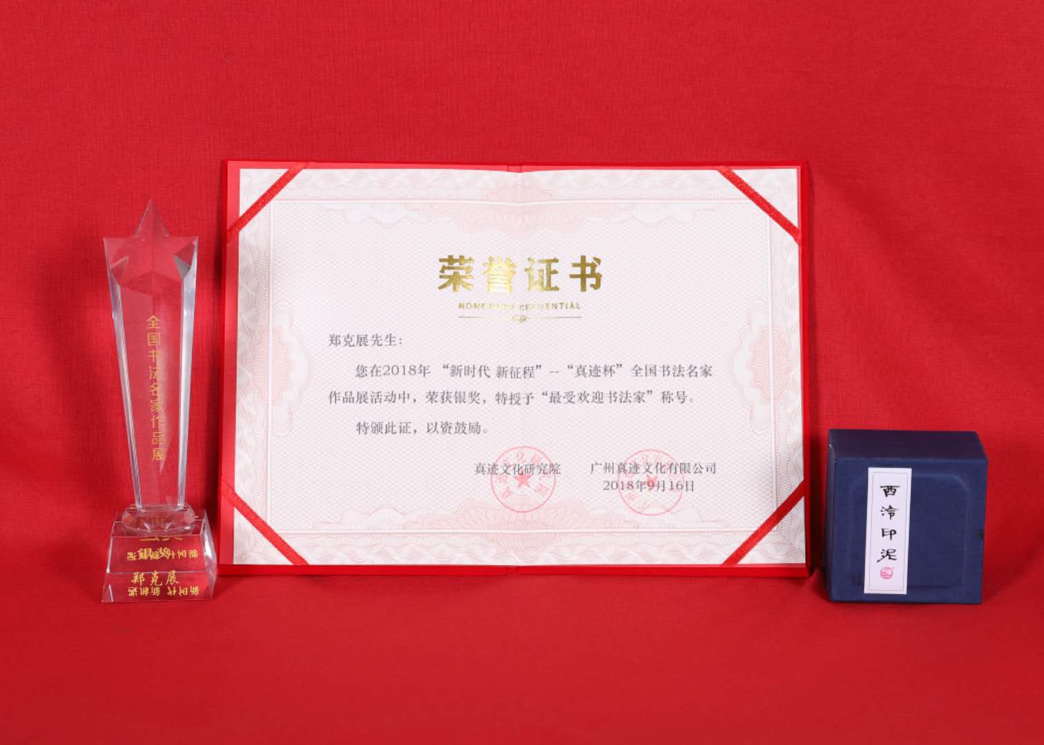 多部作品被权威机构及社会精英人士永久收藏。在“真迹杯”全国书法名家作品展中获“最受欢迎书法家”荣誉称号。