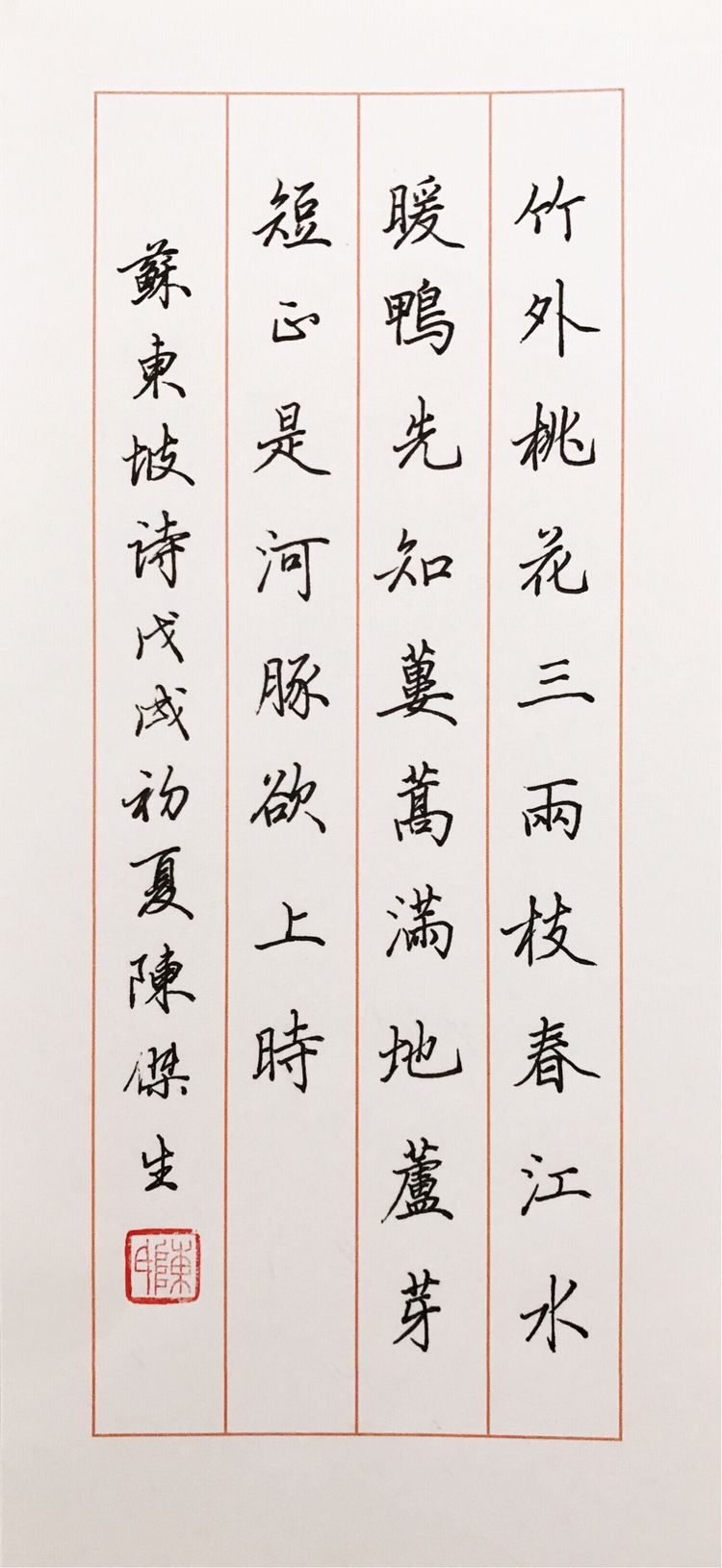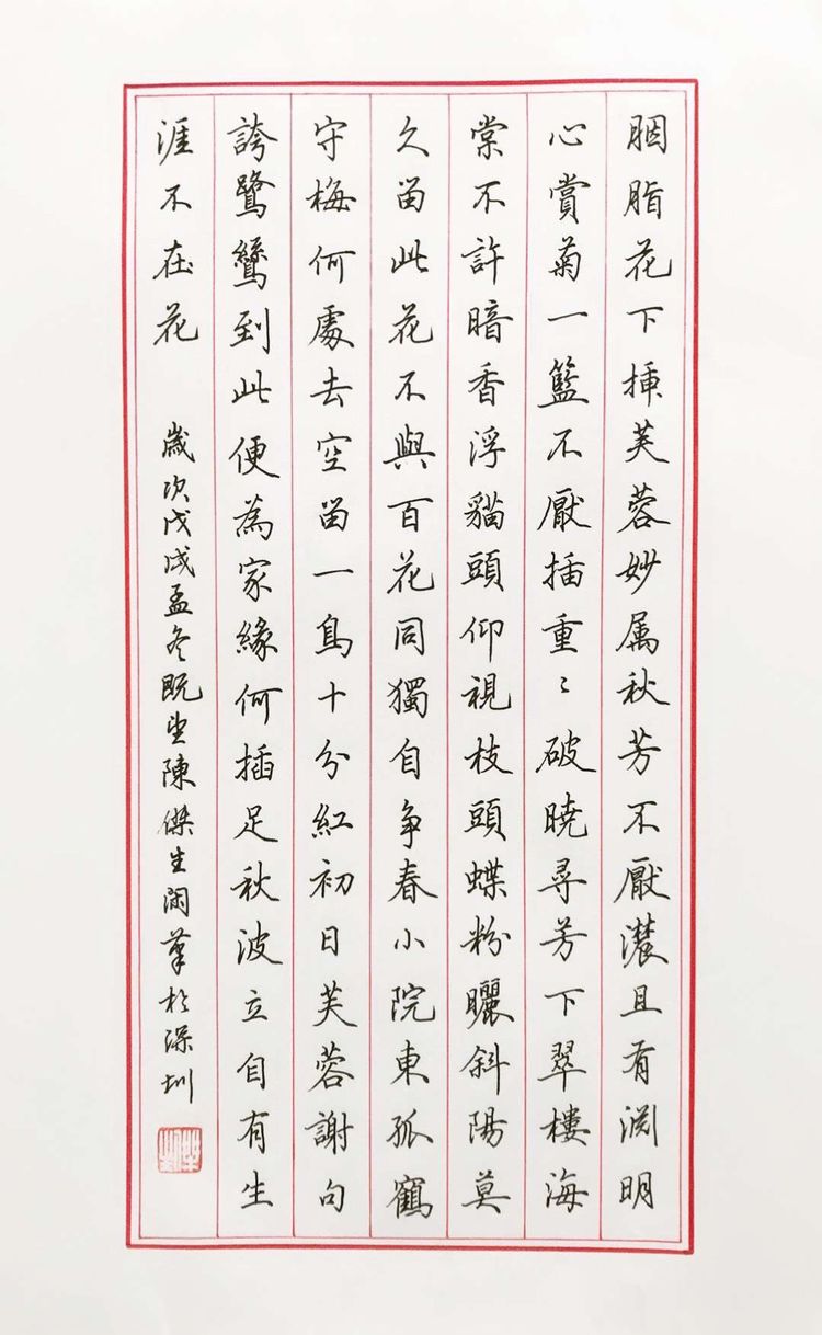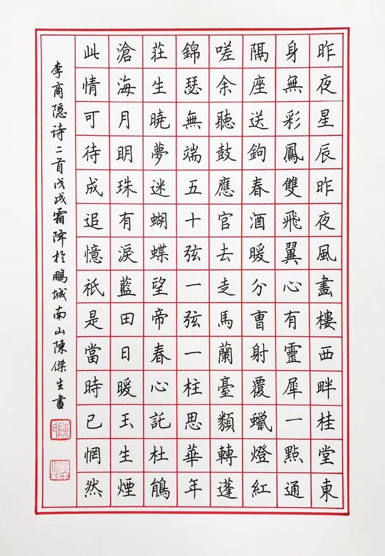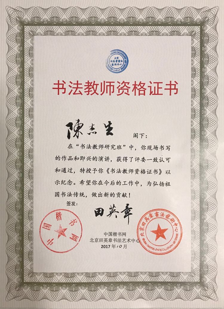 2017年作品荣获第五十二届田英章书法特训班现场书写比赛第一名,