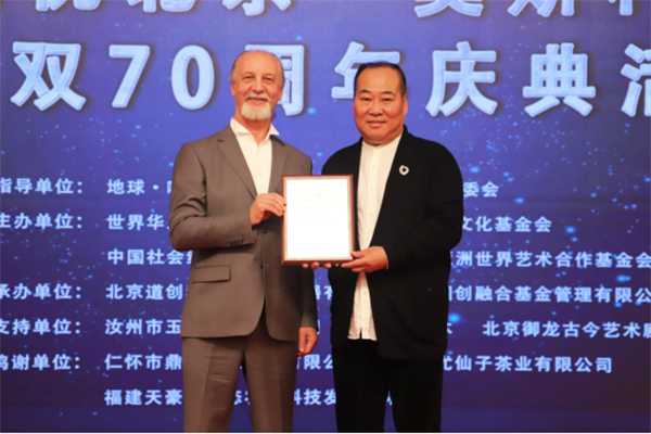 俄罗斯亚洲世界艺术合作基金会主席谢尔盖向张凤山颁发“中俄双70周年庆典活动”形象大使证书