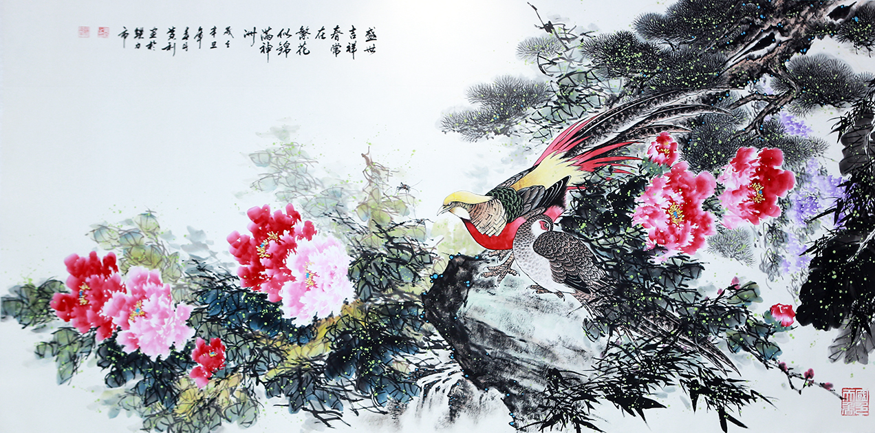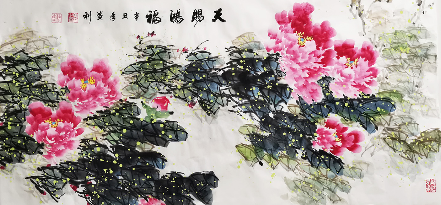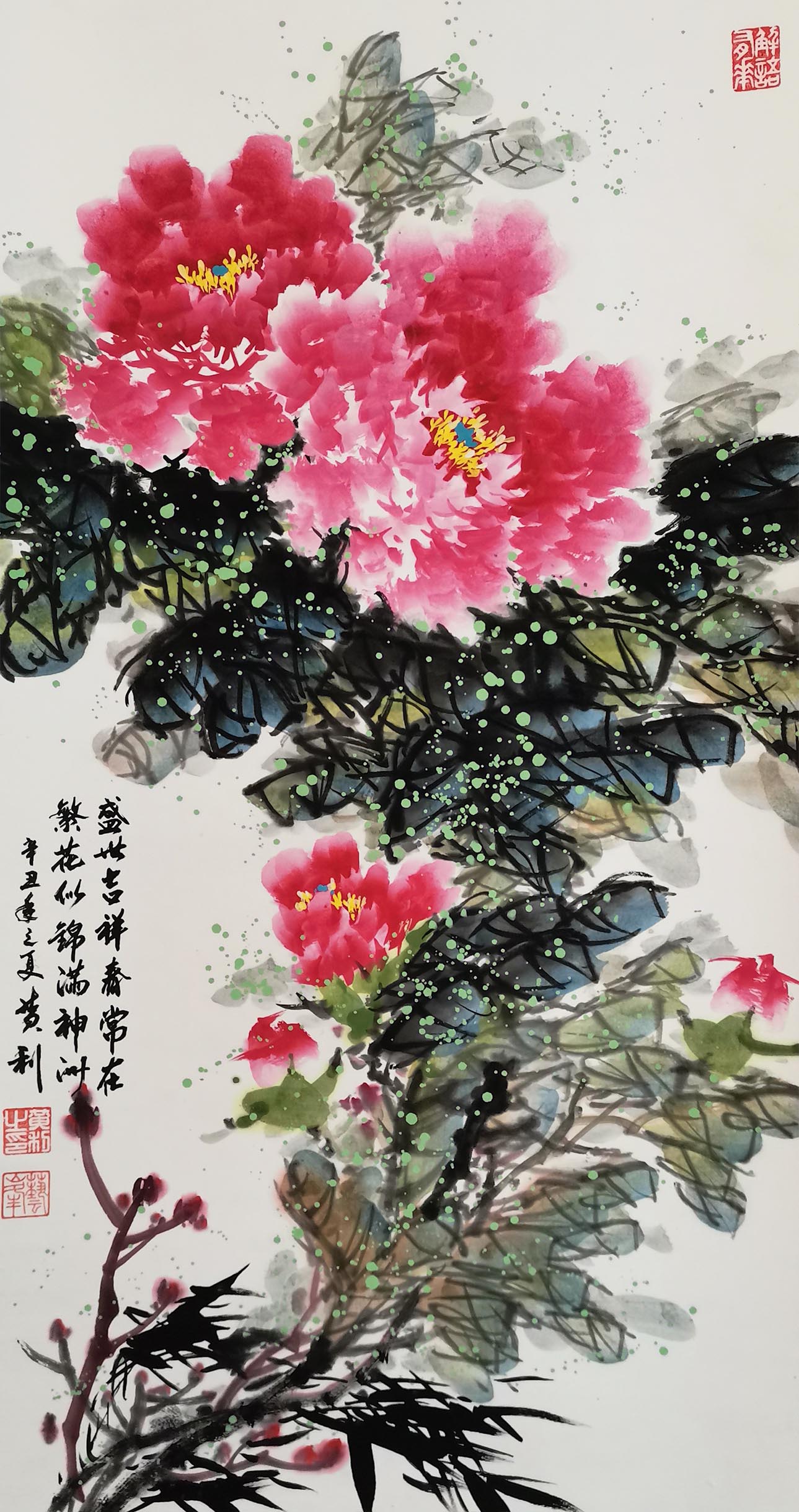 2018年伊春市市长和德国东根市市长,在伊春美术馆举行文化艺术交流笔会,我的牡丹花《春满乾坤》当场被伊春市领导捐送给德国东根市市长。