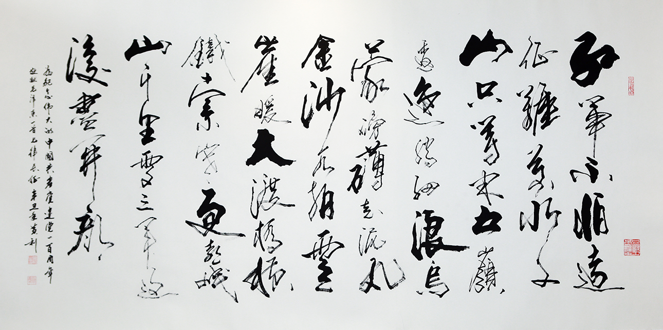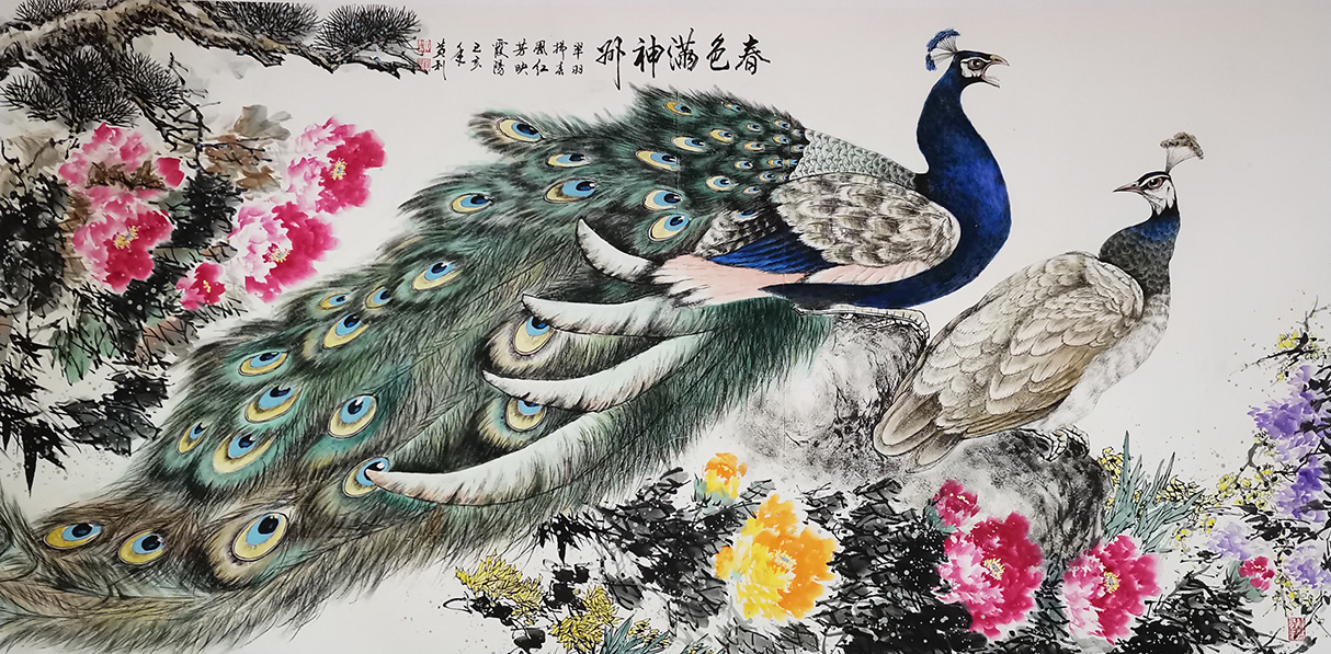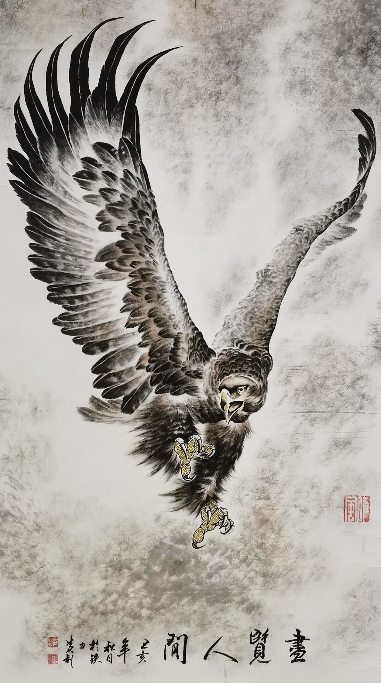 黄利花鸟动物作品的创作,有工笔作虎的掠物象之体貌,有工笔小动物的趣味盎然,有工笔苍鹰的英雄寓意,还有牡丹写意的夺物象之精神,都带有很强的写生功底,全是置物于眼前的精益求精。所以他的花鸟动物人物作品,也是法度正宗而严谨的证见。其中工笔人物系列作品有超写实功勋,也有笔墨当随时代的表现力。人体妙作唯美,国士壮作刚劲。为毛主席、开国元勋创作群像,嵌入了红色艺术基因,件件都是正大气象。大写意飞马作品,极尽意由心成的表达,在大墨淋漓的恣意铺陈中,让马作飞云,可以纵横天地,带来直趋眼前的冲击力,这是把大写意的技法与表现力都推上了一个新高度。