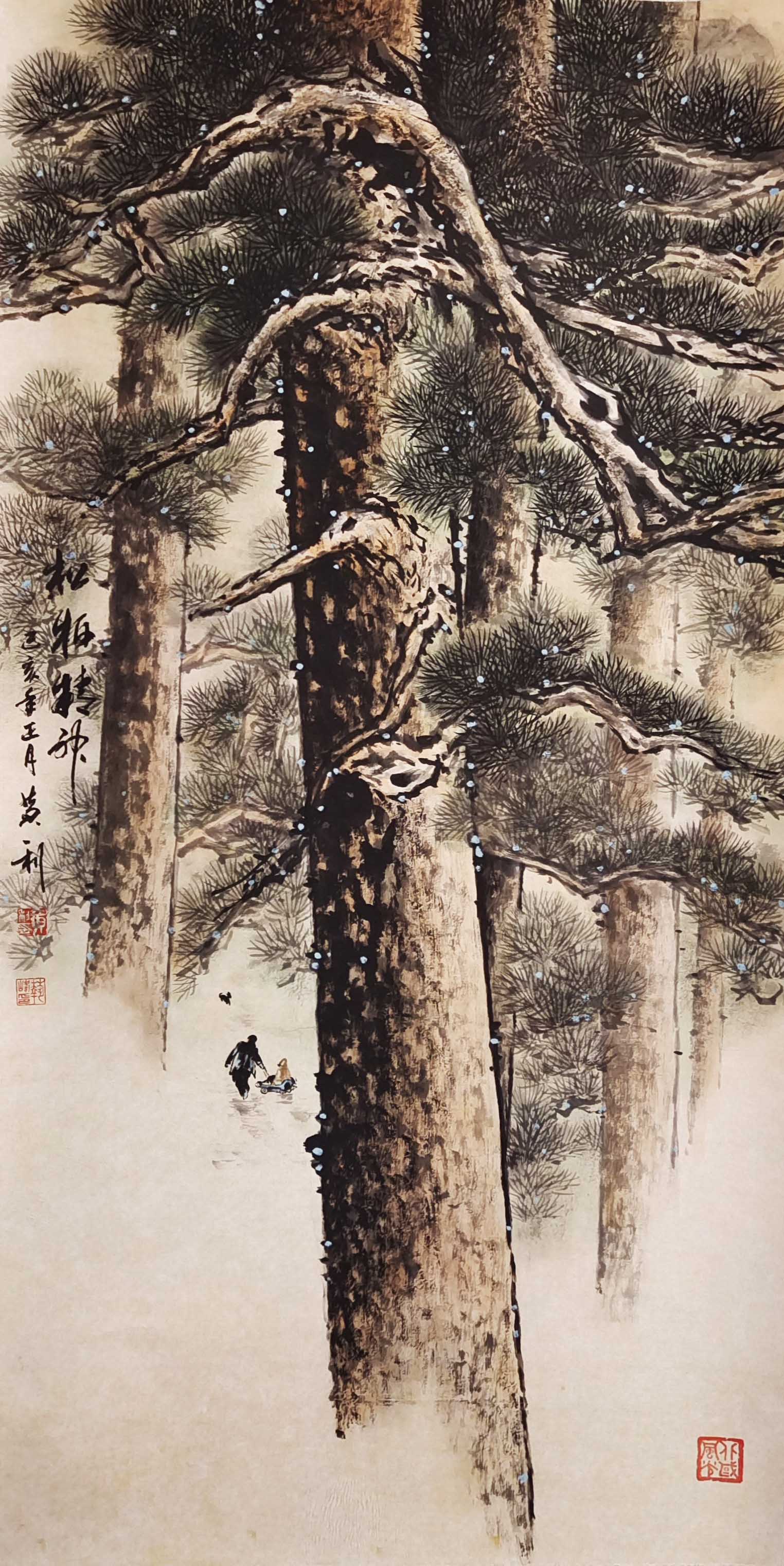 观赏黄利先生的丹青作品,首先会被他精心塑造的挺拔劲松所震撼,这种极有精气神的写生法度,足以让黄利先生成为亘古未有的松画一题的大手笔。林海雪原的生活经历,磨砺了黄利先生刚毅的非凡气质,所以他画松树有矗立乾坤的威仪雄姿,又有苍翠迎雪的不屈精神。成为这一画题的领衔人物,实属功到自然成,是一位名副其实的松题神笔!