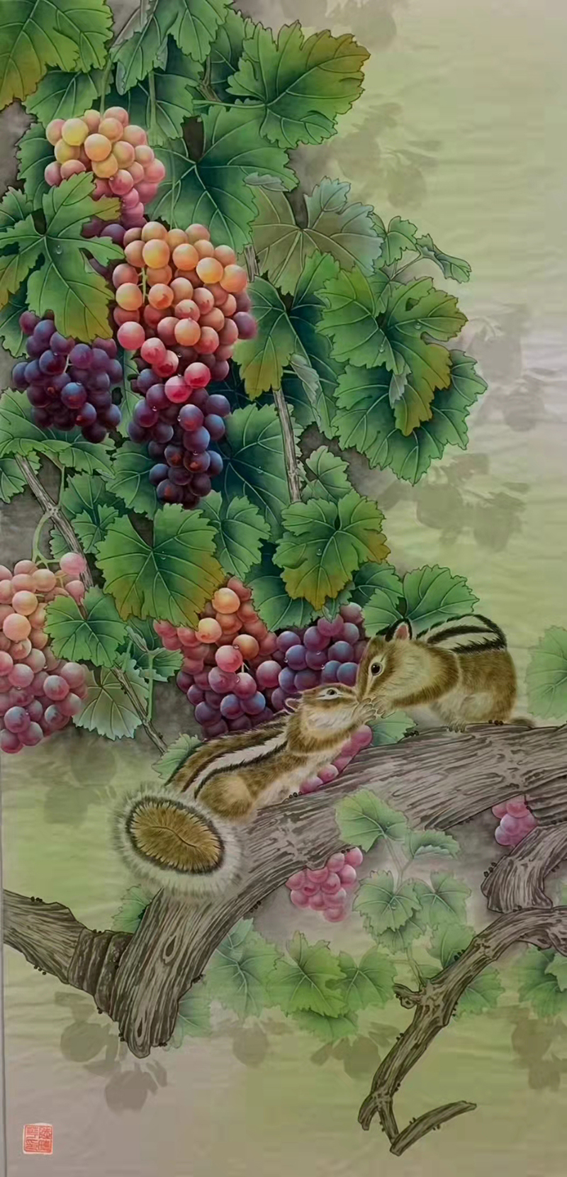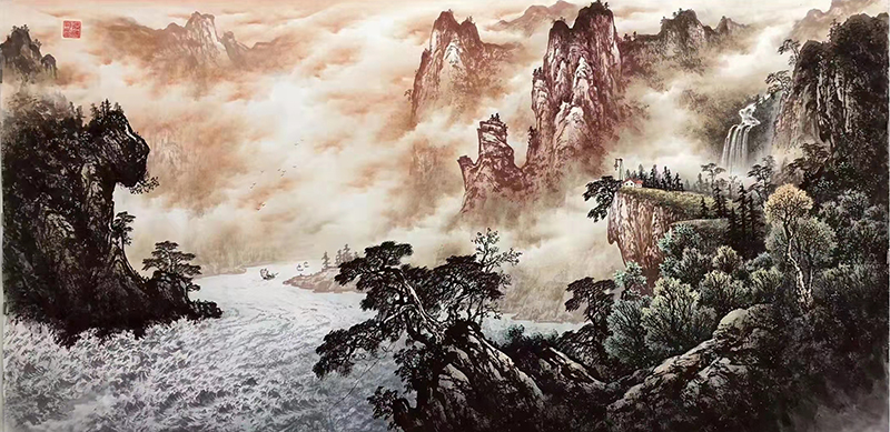 纵观其绘画作品,用笔技法扎实老练,用色大胆果断,构图布局严紧,画面气势恢宏。