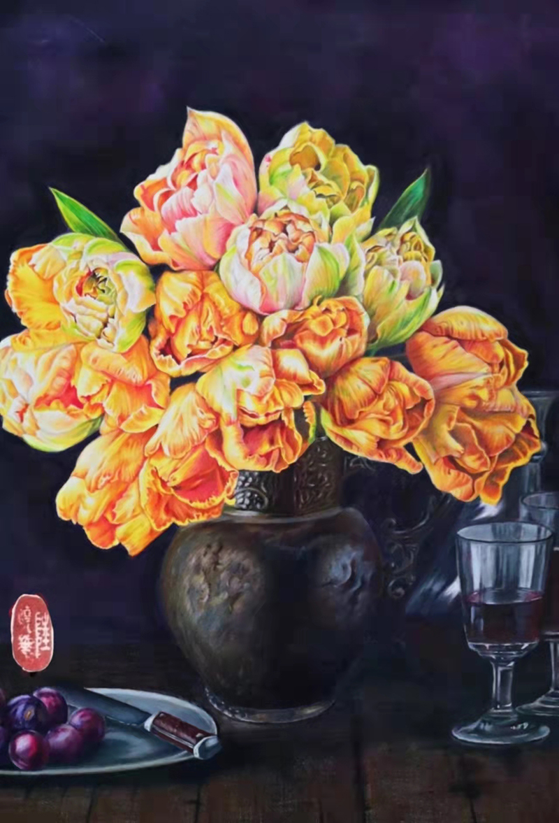 其彩铅画线条肯定、流畅,分层叠色、点彩、压刮等技法运用灵活,能借助渐变的缤纷颜色,表现出描绘对象轻盈、通透的质感。其工笔画行笔稳健,起收自然,顿挫转折富有变化,勾勒染色技法娴熟。其彩墨山水画不受陈规约束,构图概括、夸张,色彩丰富、鲜艳,题材广阔,极富创新精神。其刀画吸取众家之长,潜心钻研,初步形成了自己独特的风格。刀笔结合,灵活交互使用,创造出了一幅幅立体感,空间感,真实感强烈,又非常贴近大自然的美丽画作。