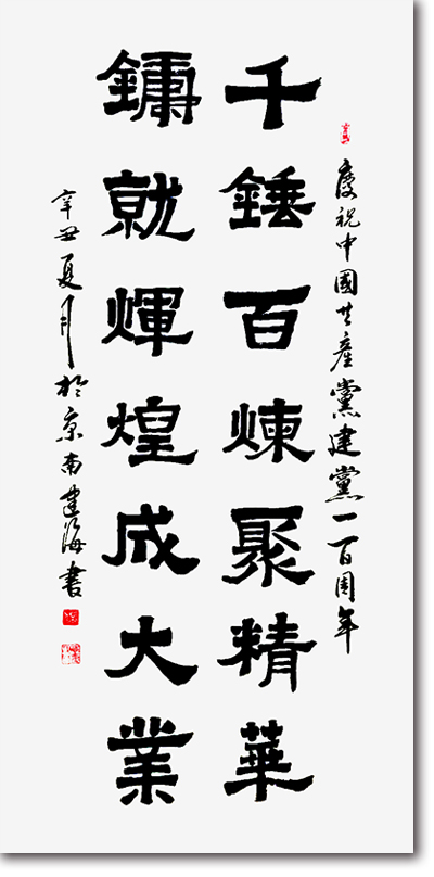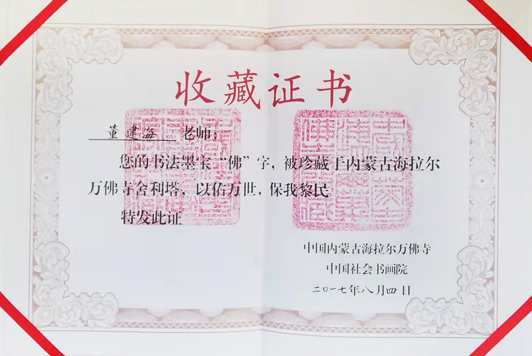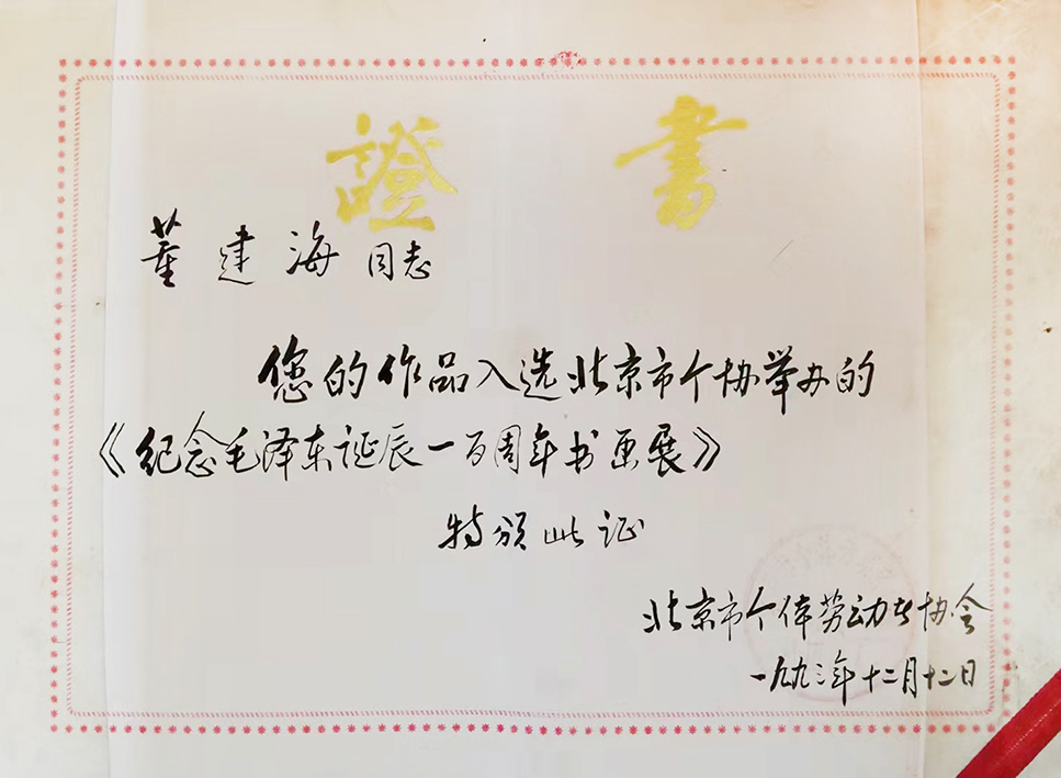 董建海:字:闲人,男67岁,北京房山区,长沟镇,东长沟村。学书40多年,现为中国榜书研究会会员,北京老年书画研究会会员,房山区书协会员,长沟西厢书画院副院长。九三年参加北京市个协书画展,获三等奖,经常参加本地区各种书画展出活动。研习行书,学二王,草书学十七帖和孙过庭书谱,隶书学张迁碑,魏碑学张玄。临多家名帖,学众家所长,虚心学习。