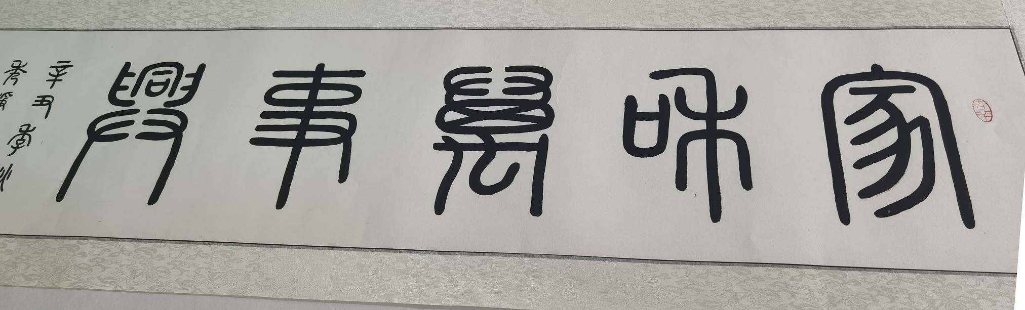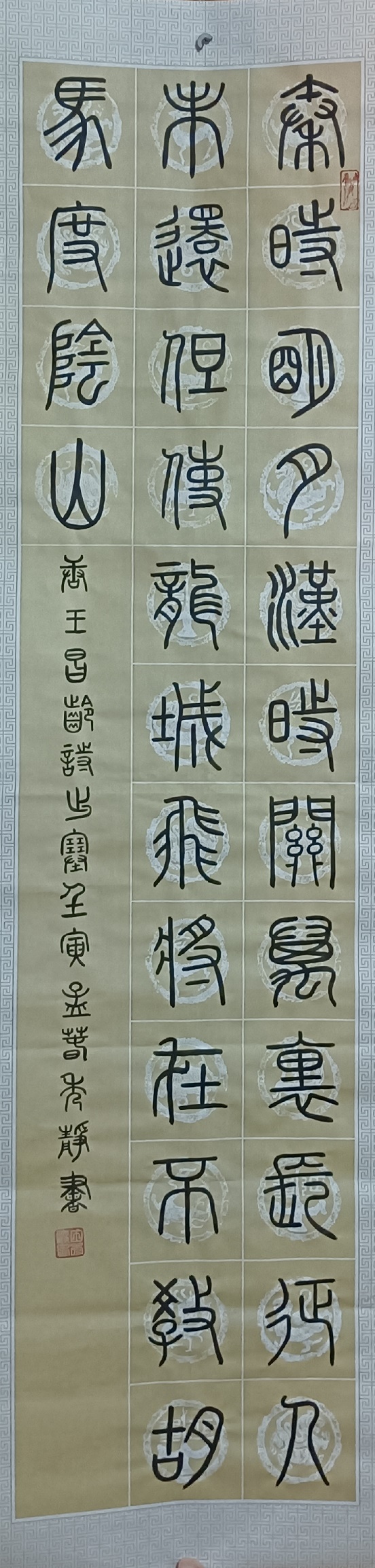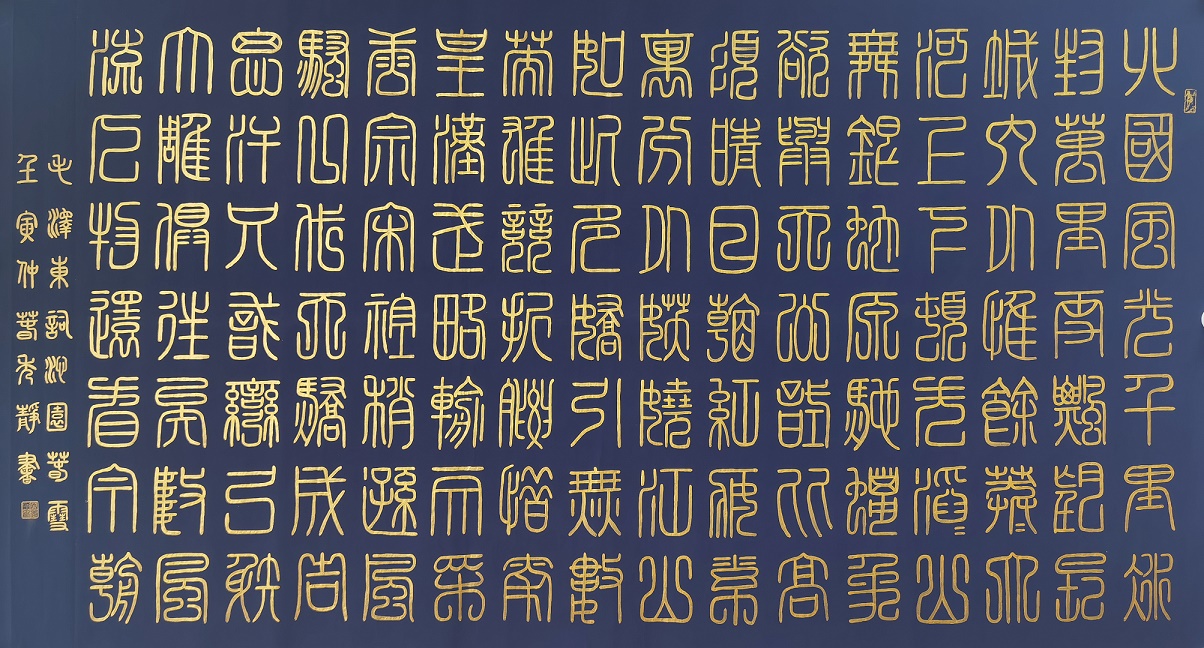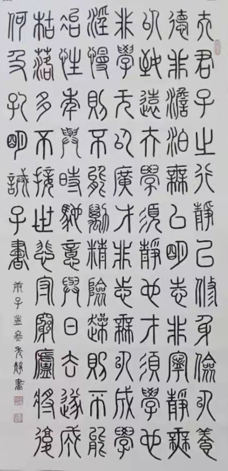 习书作墨,必须要经受学养的熏陶,一个人若是没得有深厚的文化修养和境界,那么他所作出的书法作品也就难堪高臻!而田秀静女士的众幅书法作品,则正是根基于个人的文化修为,她的学养不仅为作品孕育了极高的文化品境,更是为书坛呈现了一股柔和的书卷气息!作为书坛中少有的女性篆书名家,田秀静女士的篆书自然是深具功底,其作中笔法不急不滞,力遒沉稳,笔线亦是缓转多姿,时而显峻健古朴,时而温润凝和,而整个的篆书章法更可谓是开张自然,浑穆大气!观之如临古碑古意,书香之气扑面而来!
