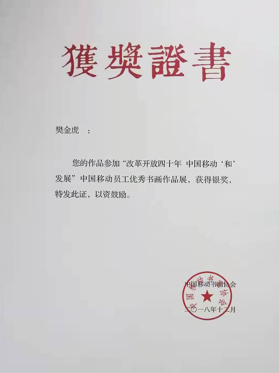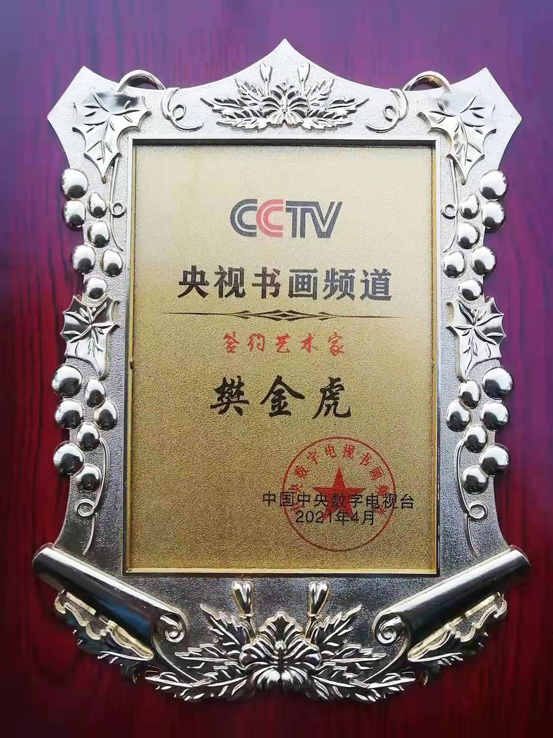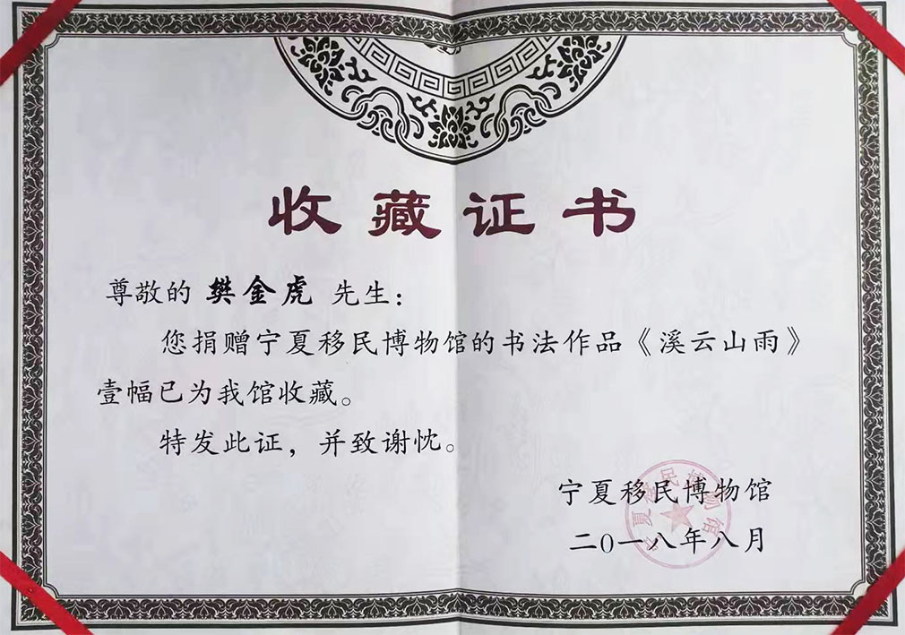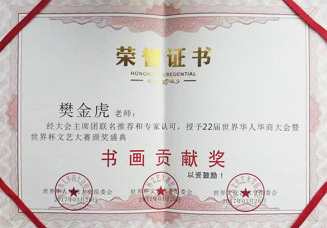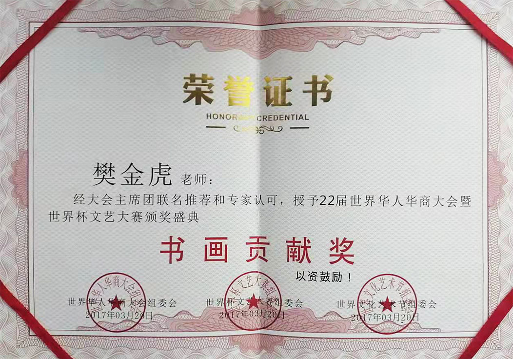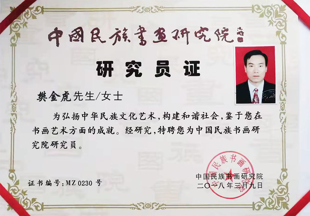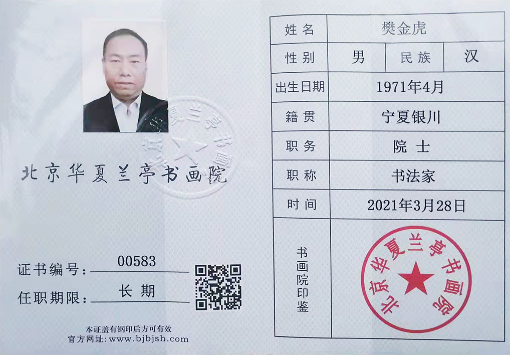樊金虎,中央电视台书画频道签约艺术家,北京兰亭书画院院士,国家一级书法师,中国非物质文化高级书法传承师,宁夏文史馆研究员,宁夏书法家协会会员,中国移动书画协会会员,中国民族书画研究院研究员,互联星空中国书画院宁夏分院执行院长,宁夏塞上画派研究员,晟宝斋书画院客座教授,银川市书法家协会理事,银川市青年书法家协会理事,兴庆区书法家协会副秘书长,兴庆区文联委员。
