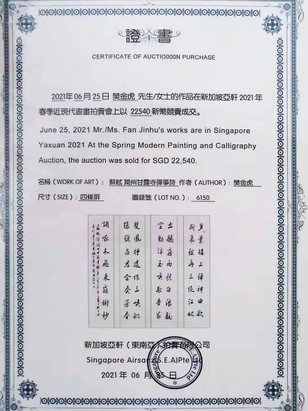 2021年6月25日书法4条屏《苏轼润州甘露寺弹筝》参加新加坡亚轩2021春季近现代书画拍卖会,拍卖成交价新加坡币:2.2540;RMB:10.9003成交。
