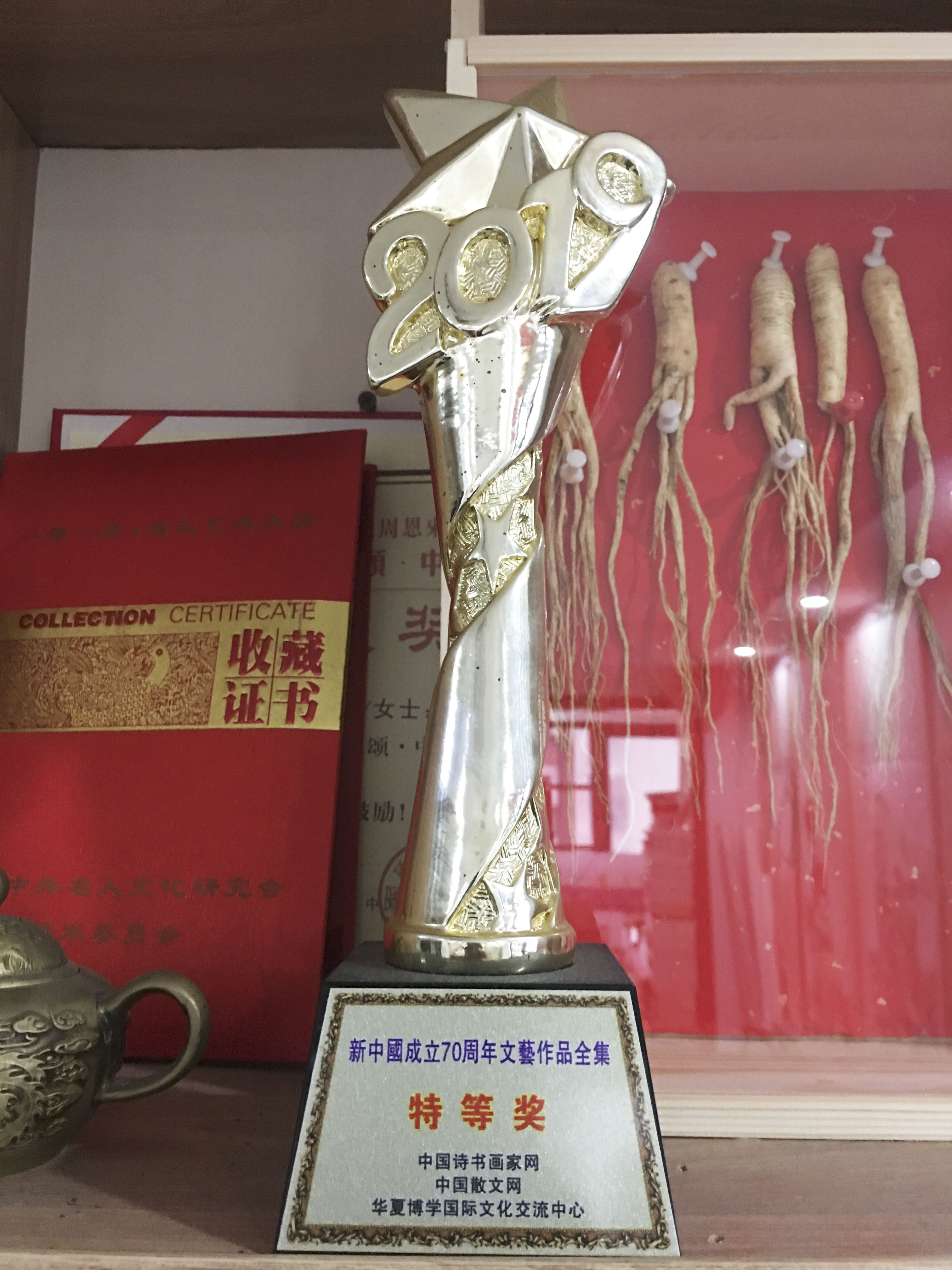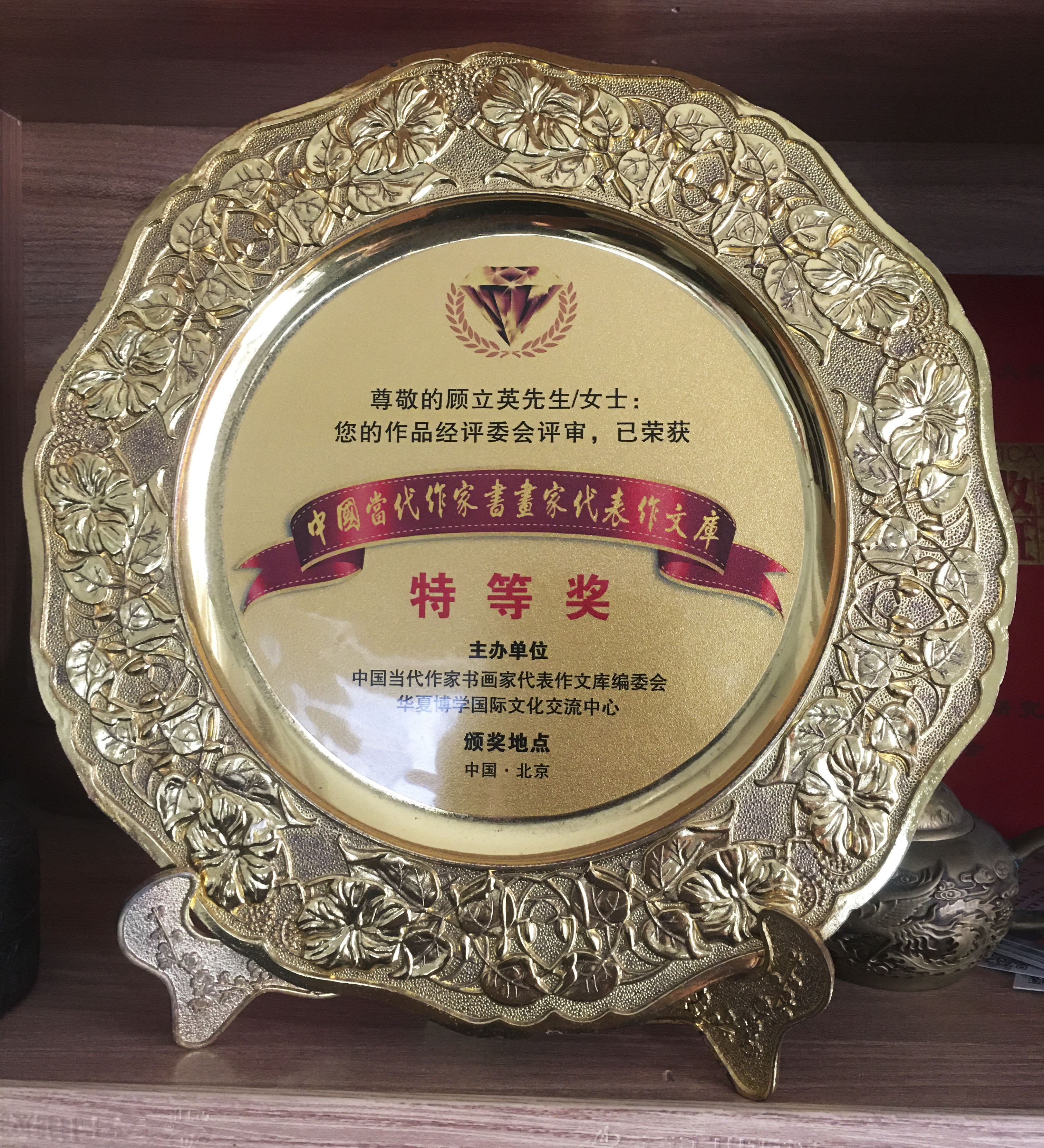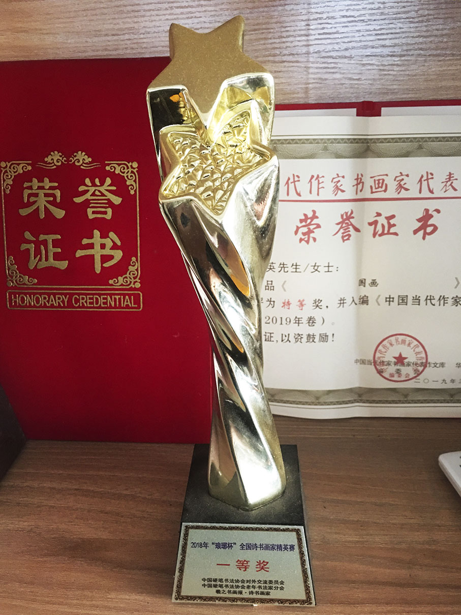 2019年5月3日,北京举行诗书画高峰论坛,中国当代作家书画家代表文库、北京华夏博学国际文化交流中心,荣获特等奖。