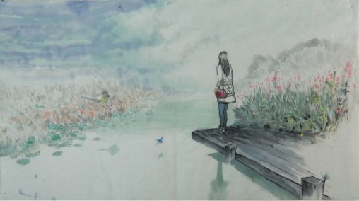 例如他创作的《长禽流云去无声 会心一笑我为峰》这幅作品,画中的她支起柔软的脸庞,用柔软去想象世界崇高中的去无声中的我为峰。她笑着告诉我们,用不着屈原式的硬度,一切皆象长禽流云去无声一样怱怱走过,那正是我们。在人类中她们是另一式高度,她没有雄居天下那种山高我为峰,有着离我不道的天然之峰。