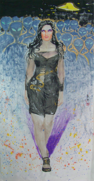 有“世界第一大画家”之称的张大千先生说:“画家自身便是上帝,有创造万物的特权”,“一个艺术家最需要的,就是自由。”中国画人物画中,历来的传统是工笔和写意。“工”,一名“细笔”,指画法工细的画风,描绘形象精细入微,一丝不苟。“写意”,一名“粗笔”,指画法简率的画风,要求删繁就简,以精炼概括的笔墨来表现出对象的意态神韵。冯海江在中国人物画的探索中,在传统的基础上创新,创造性地将写实主义技术种植在中国画人物画精神上。精神上的写实成了他中国画人物画的发挥手段。所以他的中国画现代美人图不一定有标准的绝伦的面孔,乍看都是街上走过来的那种被泛口的美女。画这样的美女好象他有种使命感,那就是在艺术升华中求实。并不是女人都可以是美丽的,但那种精神上的情态只要是真的实在的,就是可以美人的。如西方文化中対漂亮和美丽理解是不同的,美丽是缷下外在的包裹的实在。只要实在了,怎么样态都是美的。那些虚拟的艺术升华的泛滥化的形式,在海江美人图这里好象都被海江的美人图的“白雪公主” 磁在周围,跳着小矮人的狂欢写意舞蹈,并在海江的艳丽的色彩照映下,舞蹈溶进了高潮,一个可能被艺术史学上典范化的高潮。