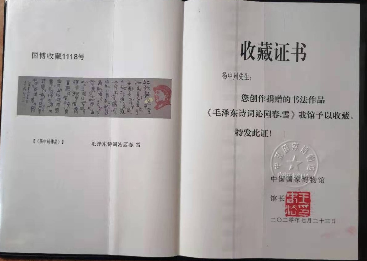 2019年,为了纪念第一次世界大战结束100周年,中国文联出版社,出版了《和平丰碑》一书,里面收集了冯远,范迪安,苏士澍,杨中州四人作品。同年,为了纪念我国建国70周年,中国文联出版社,又出版了《辉煌伟业——书画界继往开来的领路人》一书,里面刊登了,范曾,范迪安(中国美协主席),苏士澍(中国书协主席),欧阳中石,刘文西,靳尚谊,杨中州七人作品。二零二零年七月杨中州书法作品《他诗词沁园春•雪》被中国国家博物馆收藏。