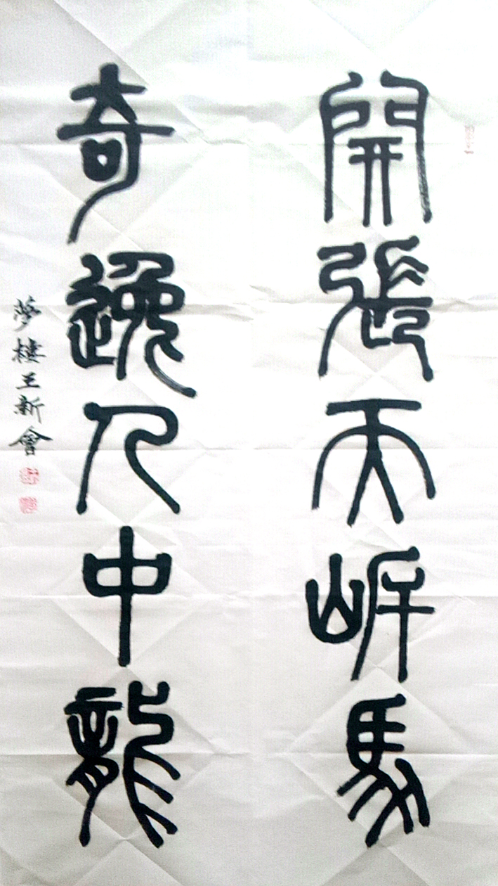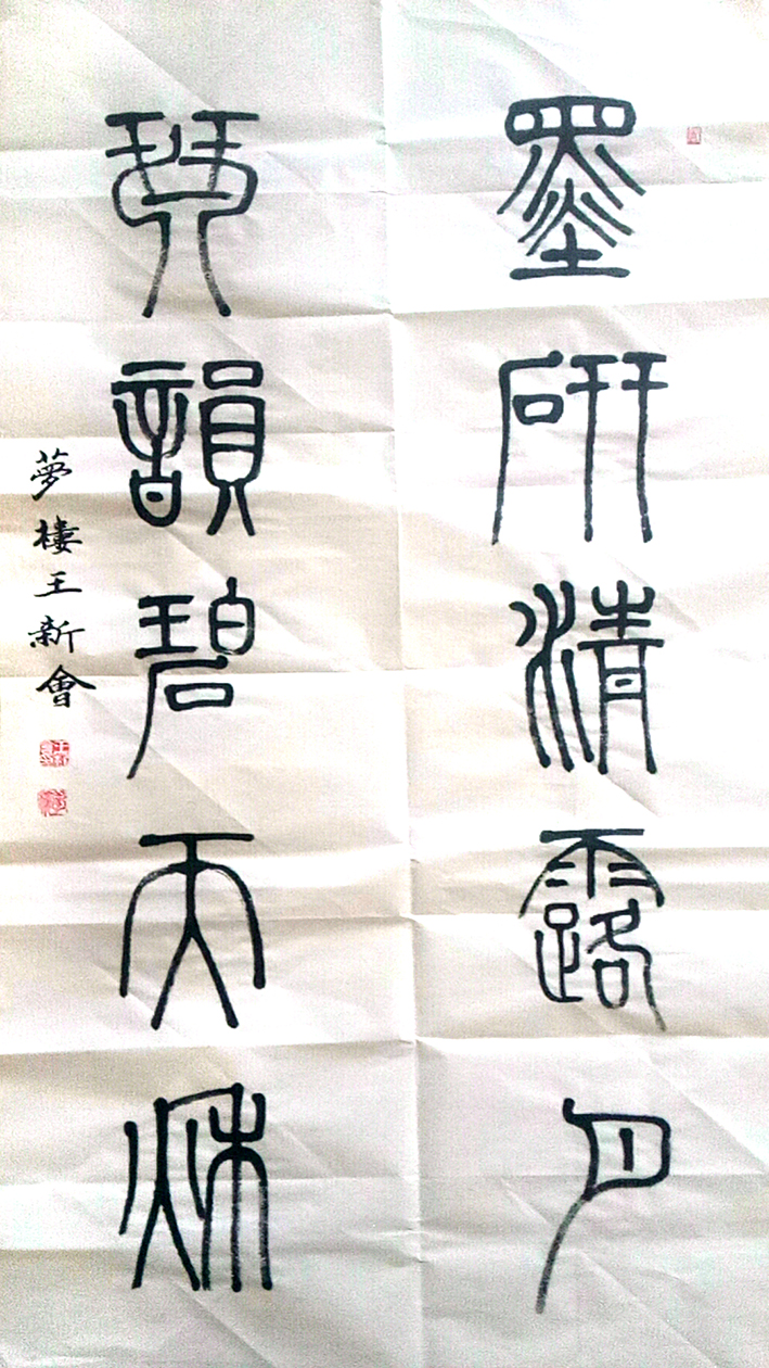 王新会,笔名:梦楼,1973年人。河南沈丘人,毕业于湖南株洲经济管理学院。 幼承家学,研习书艺,师从豫东名儒谢云峰先生,沈丘四大才子小篆名家高明远先生,临习书法二十余年,作品入选2020年河南省第二十九届群众书展并获优秀奖。 现为: 北京艺善源艺术家委员会会员,豫东印社会员,沈丘县书法家协会常务理事。