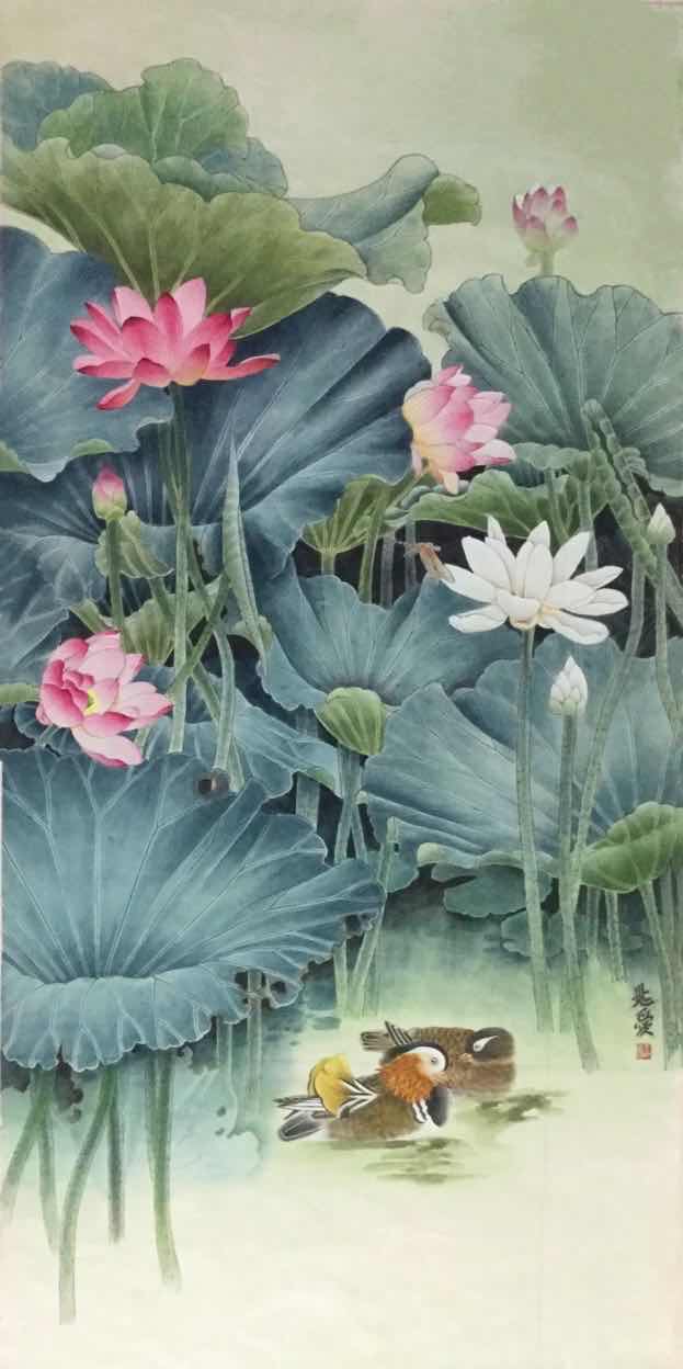 湖中戏水鸳鸯对,缱绻柔情。