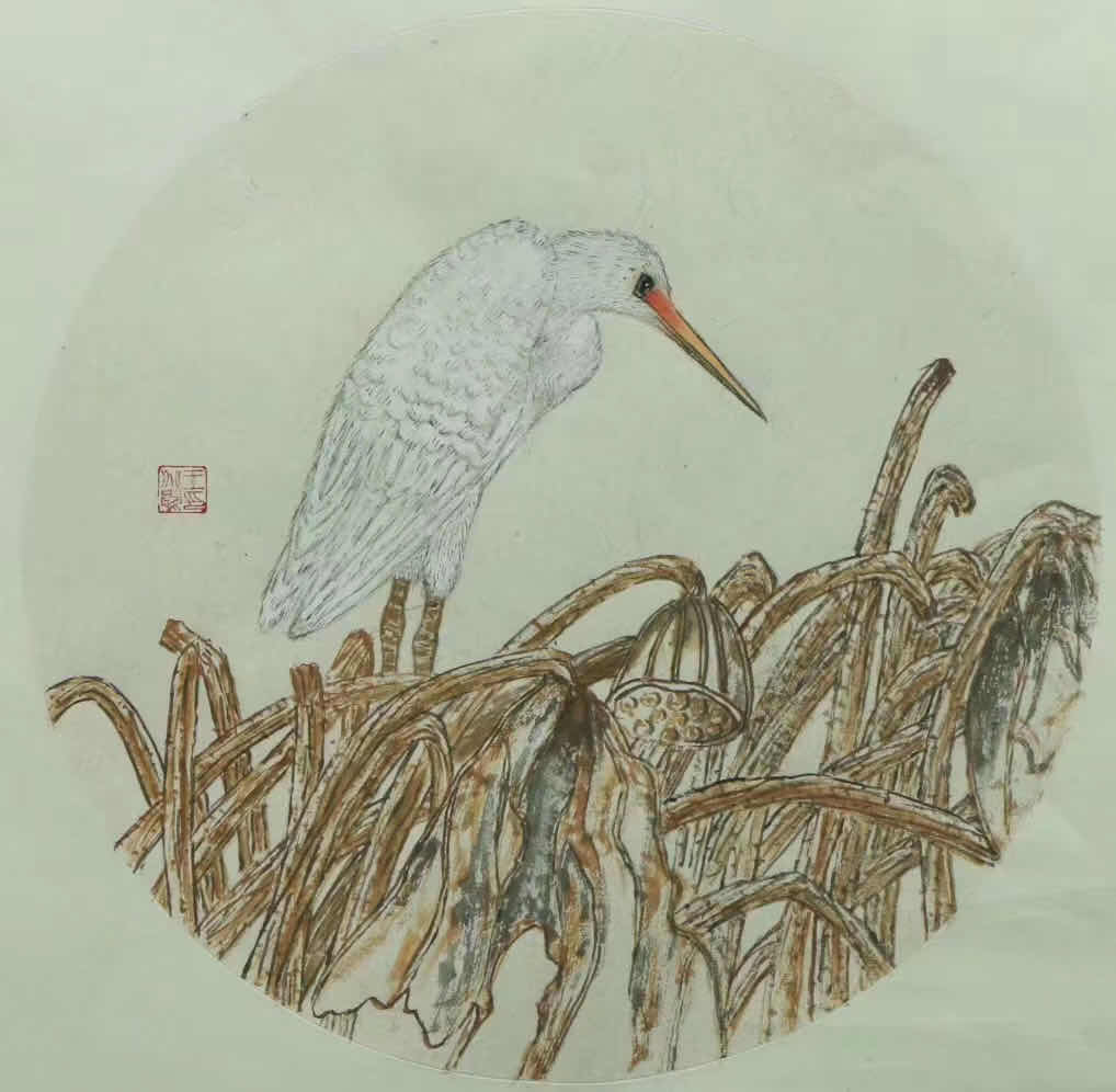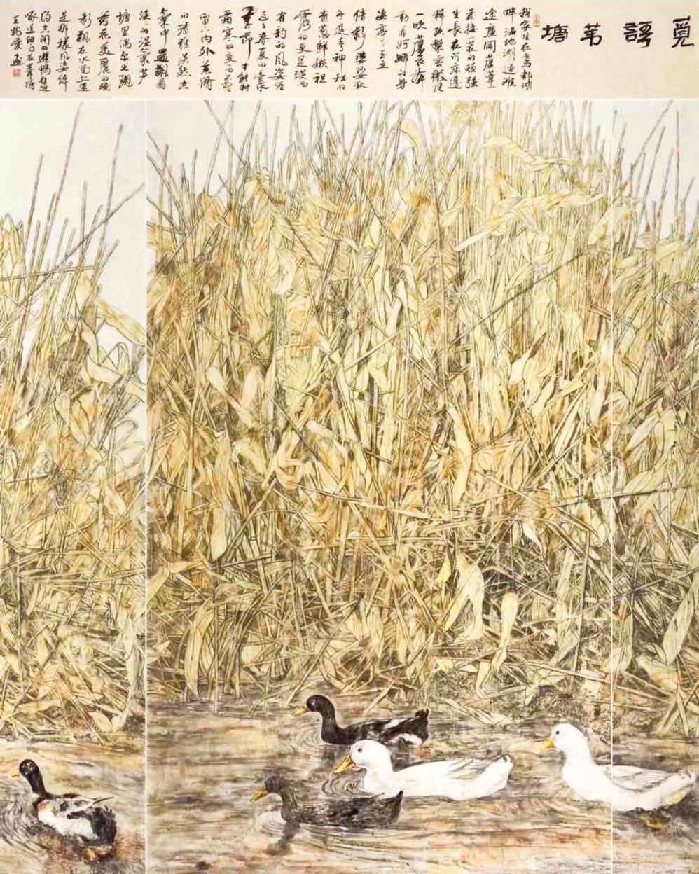 芦苇淍,鱼花纠,野鸭欢浯,鹭歌莺秀。