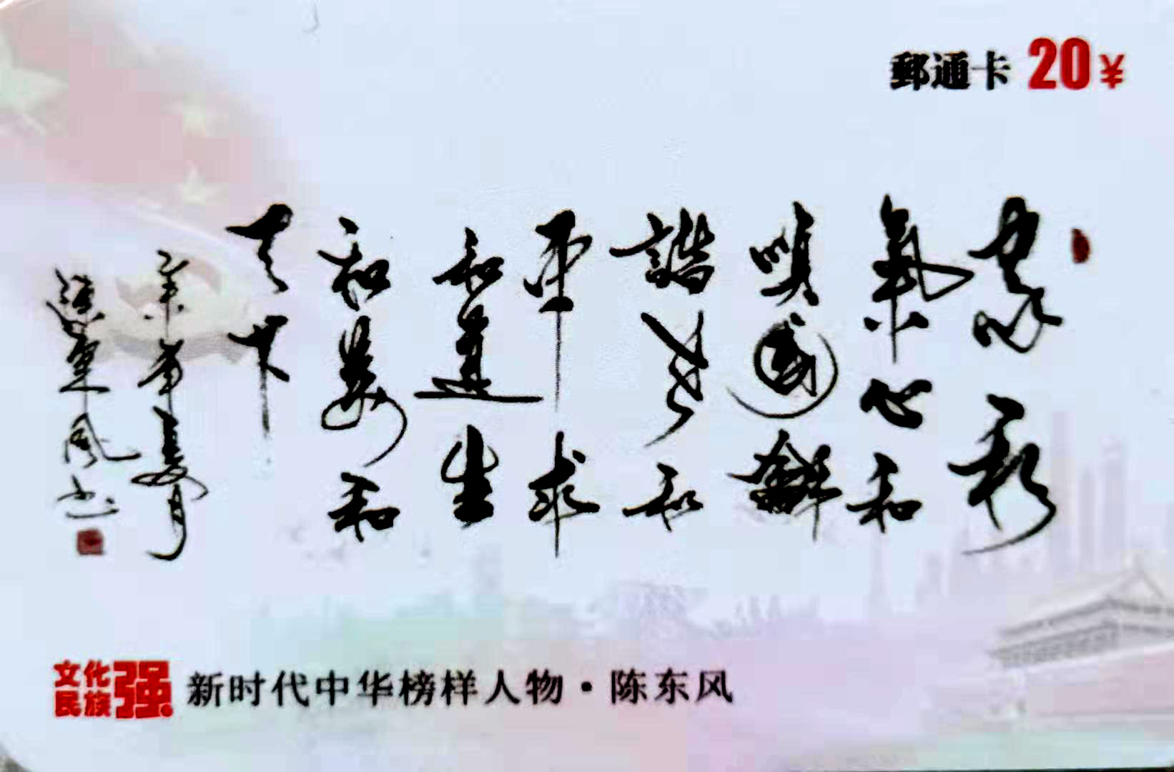 陈东风,男,出生于1957年,祖籍河北沧州,现居张北县,1974年下乡知青。自幼爱好书画,现为河北省书法家协会会员,中国光禄山书画院院士。河北省文化名人公益联盟副秘书长,海内外名人名企交流协会文化会副秘书长;河北省文化名人公益联盟书画院院士、副院长;张北书画分院院长;河北省散文学会会员;河北省民俗文化协会会员,河北省伏羲文化书院理事。张家口书画艺术家联合会副会长;张家口书画院院士;张北老年书画院院士。其作品功底深厚,寓意新颖,自成风格,得到专家、学者的好评,作品多次参加全国、省、市展出;并参加了马来西亚书画展并获亚军奖牌。于2019年一月被中国邮品研发组委会,中国集邮宣传中心网授予“新时代中华榜样人物”称号。