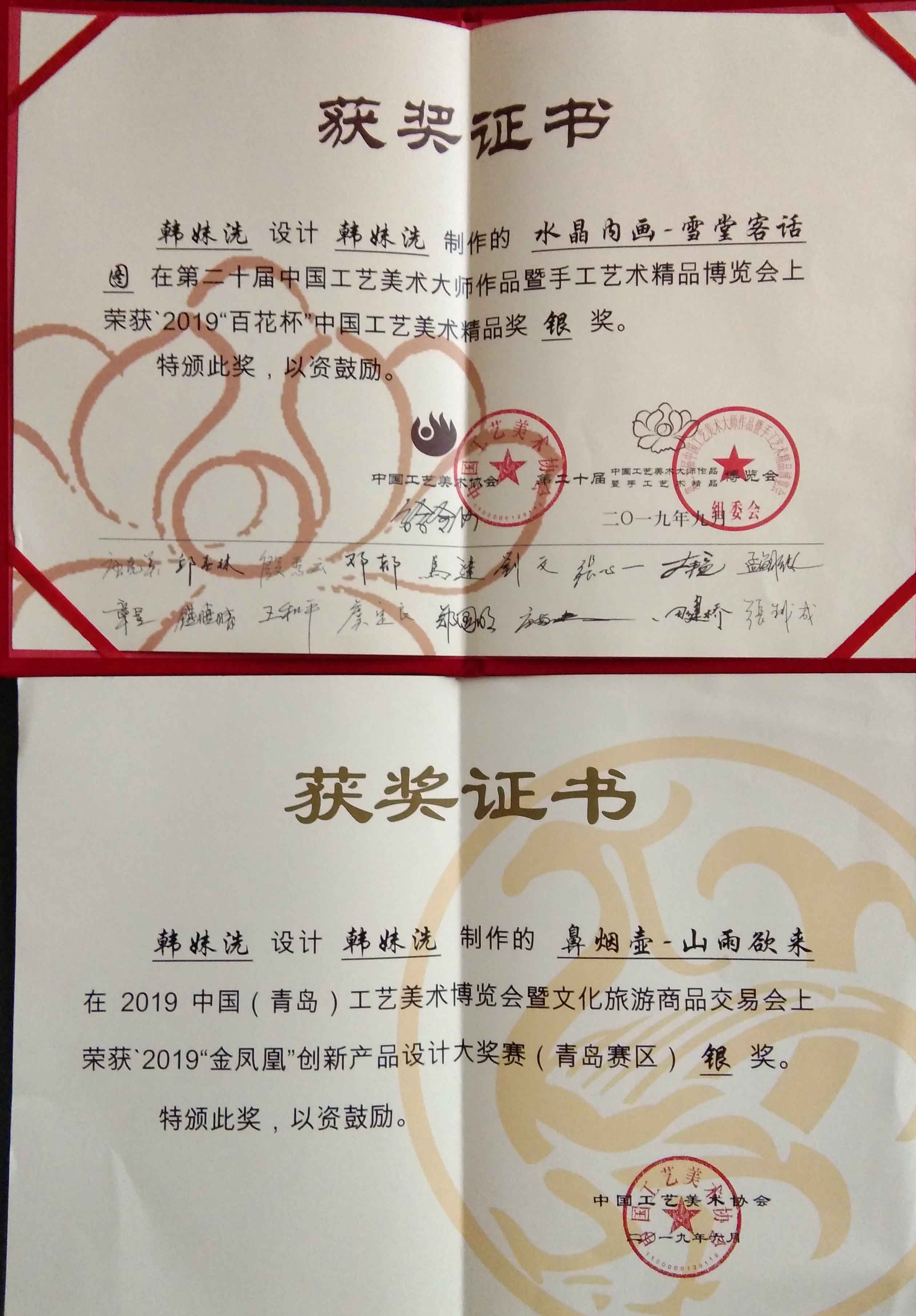 2019年内画作品《山雨欲来》荣获“金凤凰”创新产品设计大奖赛(青岛)银奖。