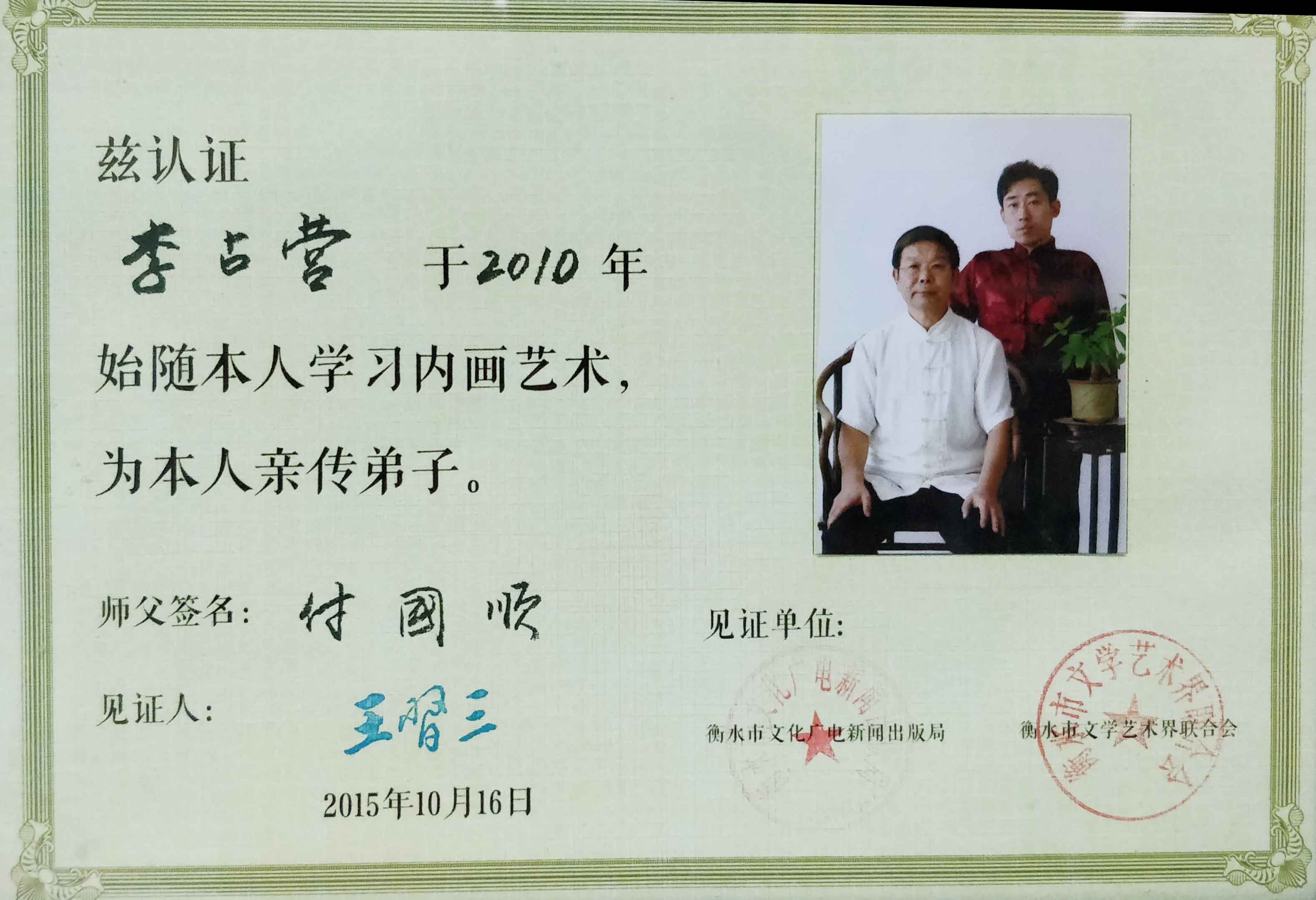 2010年,拜中国工艺美术大师付国顺先生为师深造,正式成为冀派内画的第三代弟子,受到师爷王习三大师的谆谆指导,在付大师的教导下,书法和绘画都有了大跨度的提升。