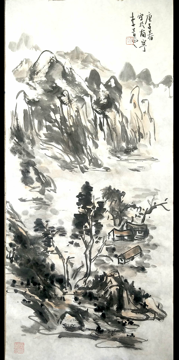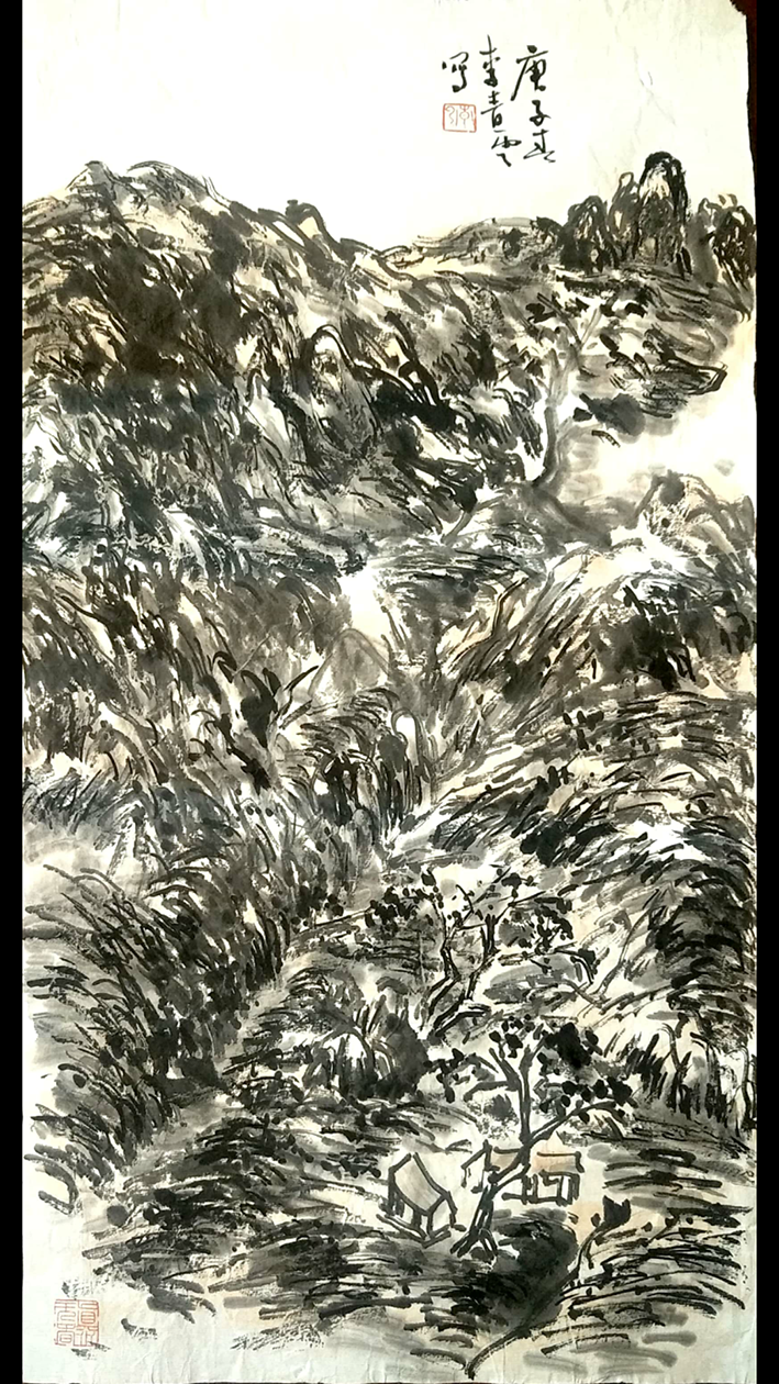 李青云的山水画受黄宾虹影响深远,其笔法墨法十分精妙,一看他的画就让人感动,有思想在里面,笔墨不单是写景,还可以写思想。他的山水画一般着色不多,墨分五色,他主要通过墨色来体现自然风物的,他的笔墨既不是用手法或者技巧做出来的,也不是用传统的画法构出来的,他的笔很活,墨也很活,不拘一格,在一幅画里各种笔法并用,但好象笔笔都有出处,合乎传统。