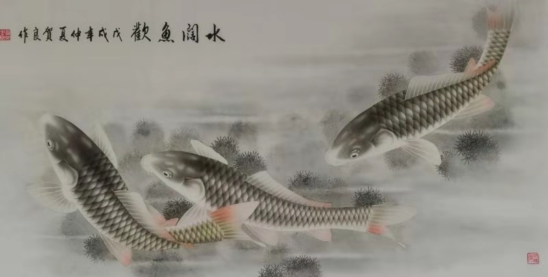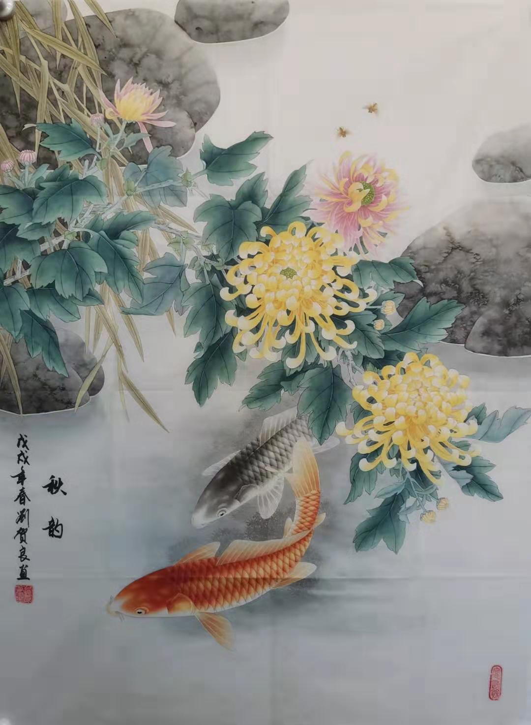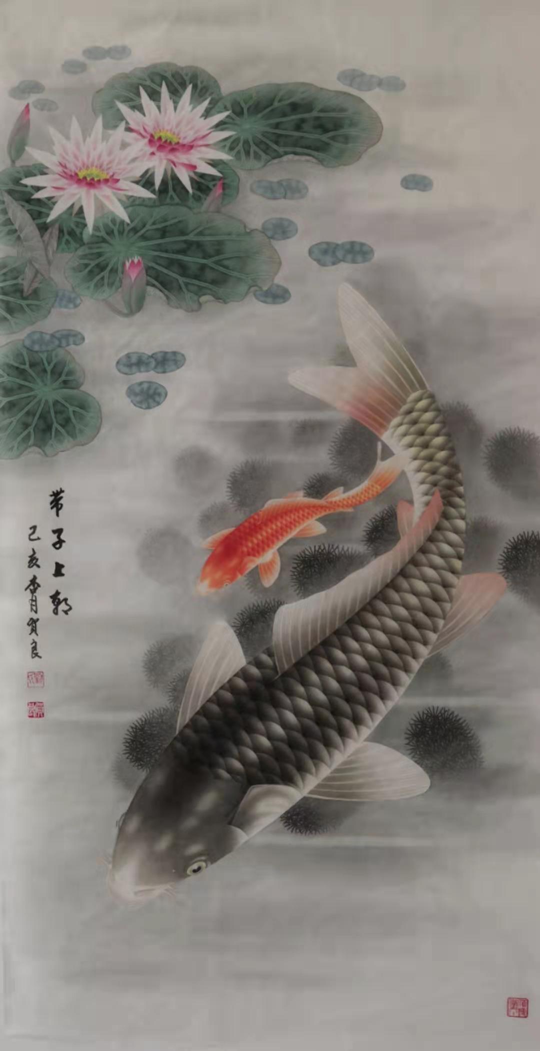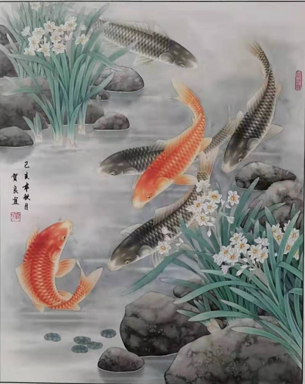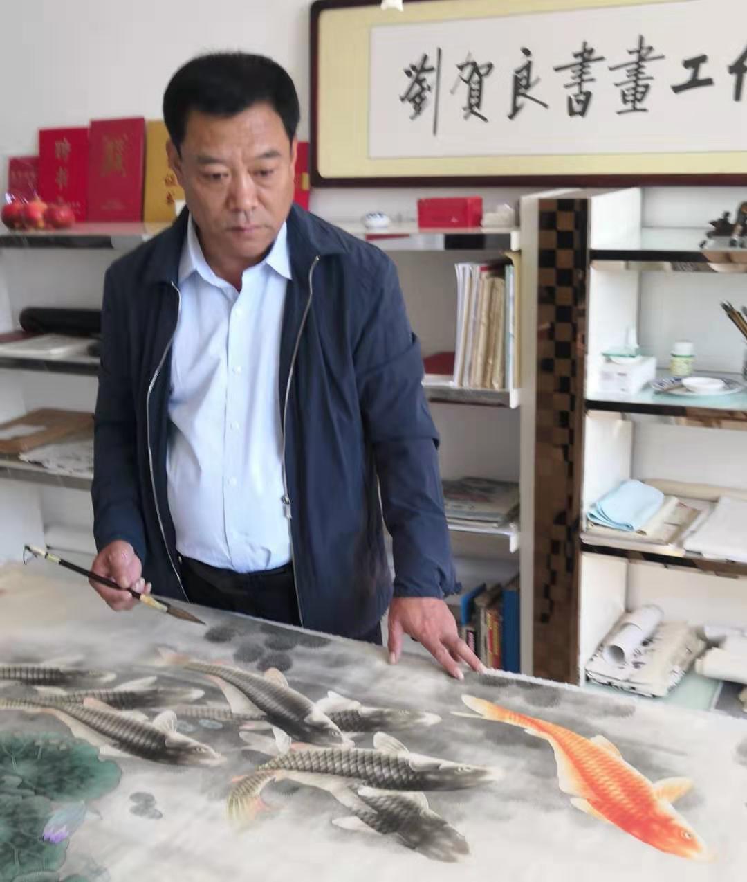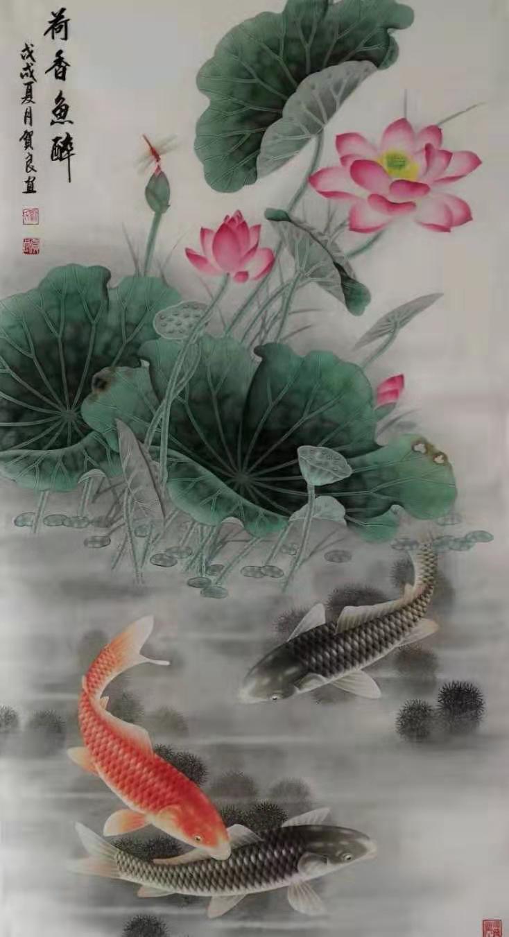 刘贺良的作品清新雅正,恬淡灵动,色调柔和,运笔坚实。是一位非常有潜力的实力派画家。近年来,刘贺良通过采风写生,反复观察研究鲤鱼的习性,师古求新,提炼笔墨技法。他追随河北名家路雨年的笔墨印痕,花鸟大师喻继高设色渲染技巧;他师从乡党、画鱼名家王忠祥,学习他的运笔灵动性。着眼家乡荷花、水仙、菊花、谷穗和鱼虫小鸟,其作品给人一种亲和、朴实、充盈、活泼之感。他大胆吸收古典唯美之风和民间年画艺术特色,雅俗共赏。