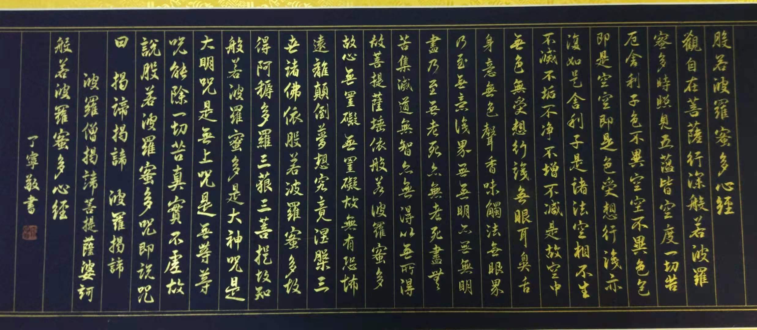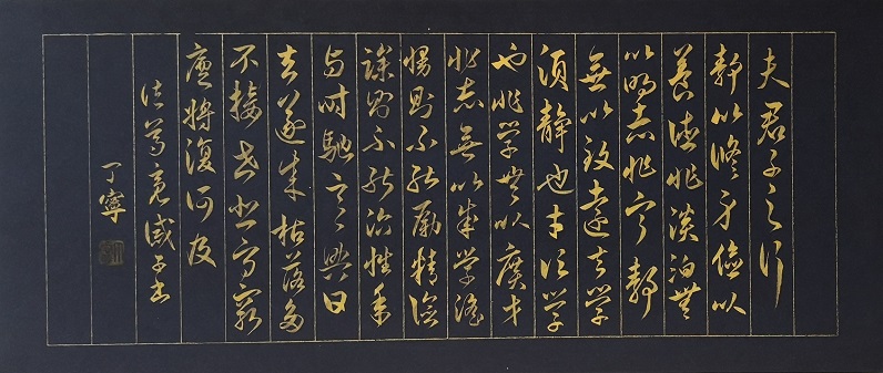 丁宁,女,1952年生,北京人,《中国书画报》社特聘书画家,北京长城长书画院会员、北京世纪金色嘉园文化艺术中心理事。自幼酷爱书画艺术,早年师从金鸿钧先生学习工笔花鸟,尤擅白描花卉。后师从郝小石先生研习书法艺术,专攻行楷,尤以金书小楷见长。书法作品多次参展并获奖,部分作品被有关单位和个人收藏。所书金书作品被中国航天员中心收藏,并颁发收藏证书。