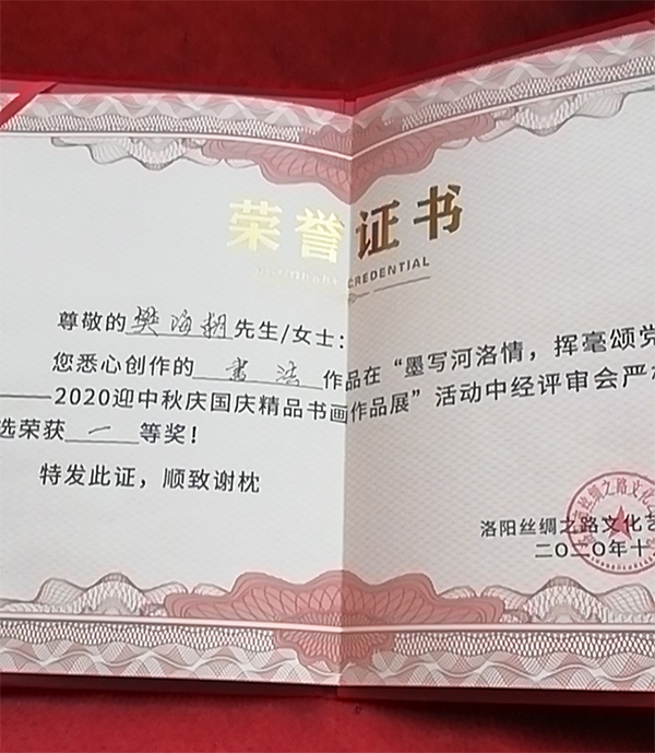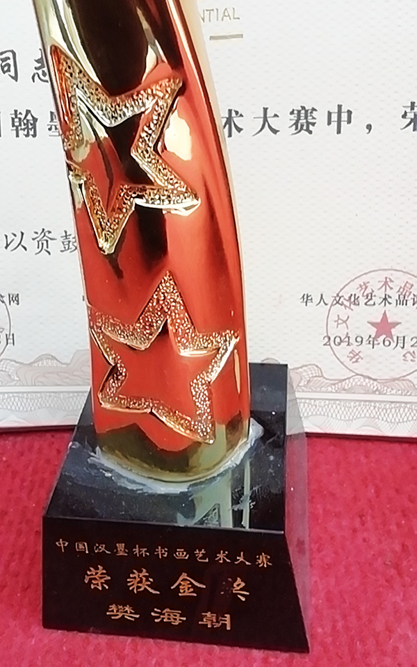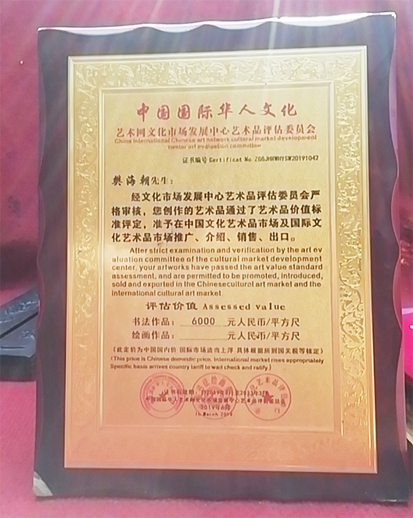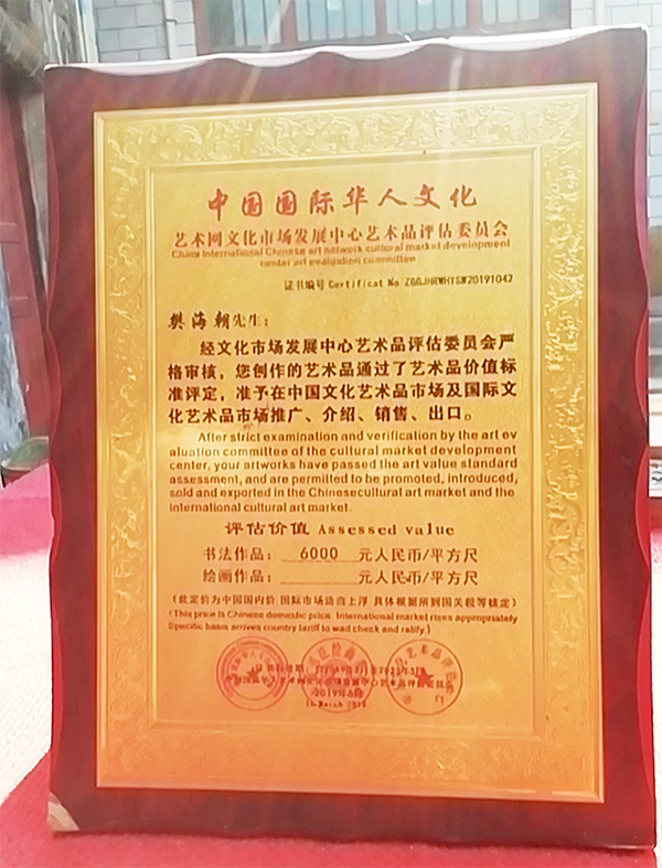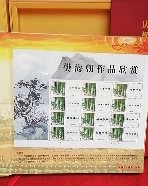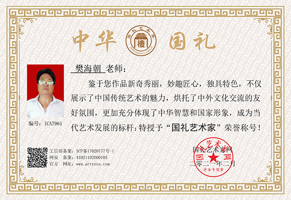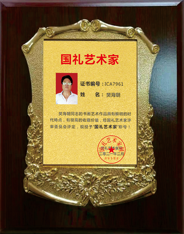 以樊海朝先生的作品、肖像等为素材的相关资料,被“庆祝中国共产党成立九十五周年”主题《中国邮册》收录,出版素有“国家名片”之誉的邮票、邮品、邮册等,并授予“翰墨丹青耀中华名家”称号。