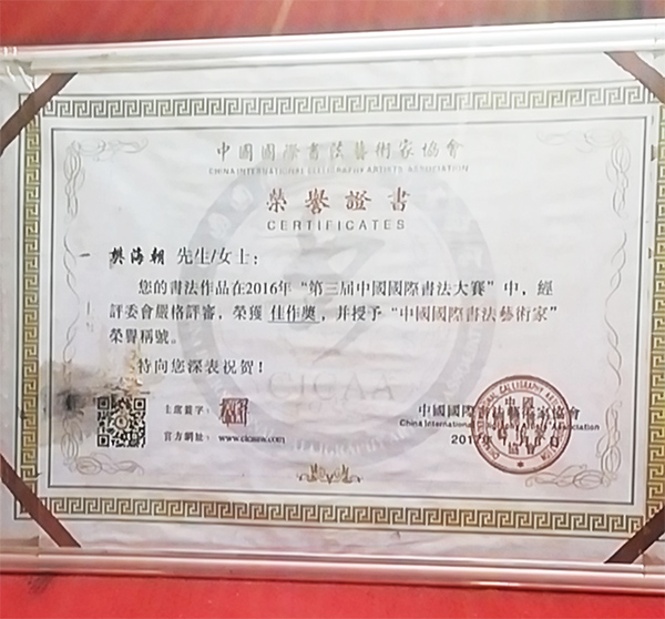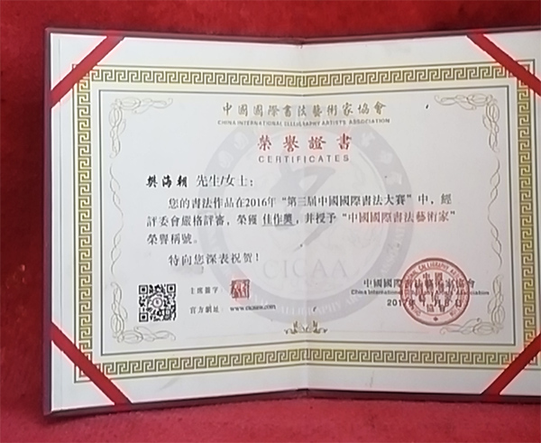 自幼酷爱书法,为了突出书法个性魅力,拜名师取精华,达到作品深厚内涵,做到闻其声,理其意,出形体,吸纳古今大家的精华,多次在书法大赛荣获金奖和银奖,全国翰墨杯书画艺术大赛中荣获金奖,书法作品在2016年“第三届中国国际书法大赛”中荣获佳作奖,并授予“中国国际书法艺术家”荣誉称号。