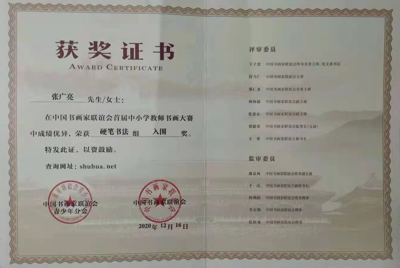 2020.12在中国书画家联谊会首届中小学教师书画大赛中成绩优异,荣获硬笔书法组入围奖