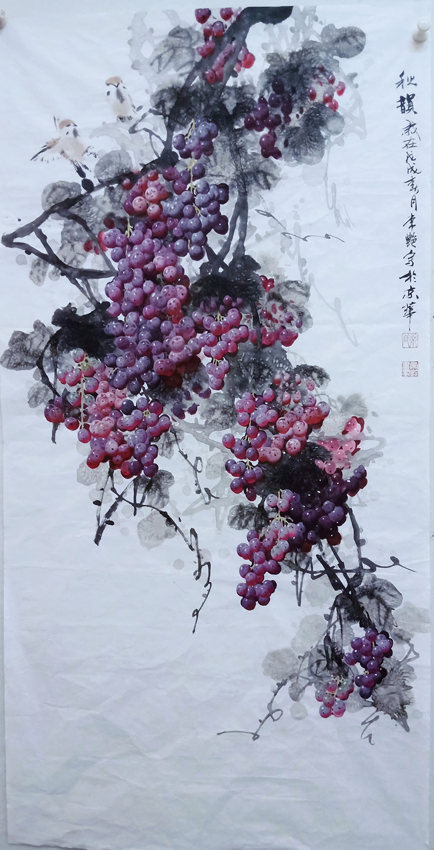 常艳女士对葡萄情有独钟。她师从于画家“杨氏葡萄”创始人--杨玉明老师。杨先生潜心研究各种国画葡萄的艺术风格,同时借鉴了西画的一些绘画技巧,将中国画的写意与西洋画的色彩、透视相结合,通过不断地摸索、总结,集百家之长,塑一己之法,逐步形成了自己独特的绘画风格。常艳深得杨老师真传,作品在学习、继承杨老师绘画技巧的基础上,又加入了自己的理解和感悟,她的葡萄质感浓郁,剔透晶莹,珠圆玉润,浓淡相宜。在她的笔下,象征着吉祥如意、多子多福、一本万利、坚韧不拔的被视为吉祥果的葡萄就像一位朴素、恬美的村姑从国风中走出来,大方而又腼腆,羞涩而又开放。在当地画坛上可谓独树一帜。