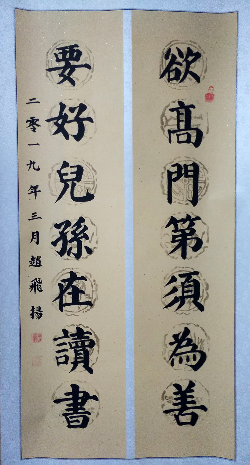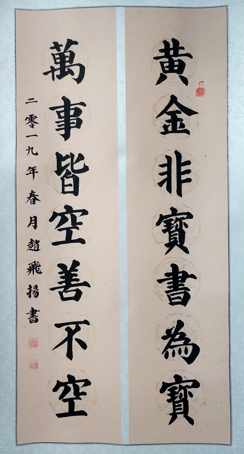 赵飞扬1982年生于河南南阳现居郑州。初习书法就被颜体的雄强和厚重吸引,逐全力研习多宝塔!欣赏赵飞扬的书法作品,给人一个最大的观感就是静,能够悠悠不破的在纸上运行,它的笔锋在纸上的运行是悠悠不破的,非常静,非常厚,非常沉稳,从他的线条里面感受到他书写时的心境是一种享受,他的作品能大能小 ,能静能动,力求朴实厚重,富有韵律感,在坚实的传统功力基础上充分发挥了自己的想象空间,用现代审美意识参与了传统艺术的某些韵律和情趣,在学书的道路上深知学无终点,艺无止境,必须静下心,俯下身,坐得住 ,坐得久 ,坚持传统,坚持临帖,唯有取长补短,细心揣摩,久久围攻,方能开花结果!