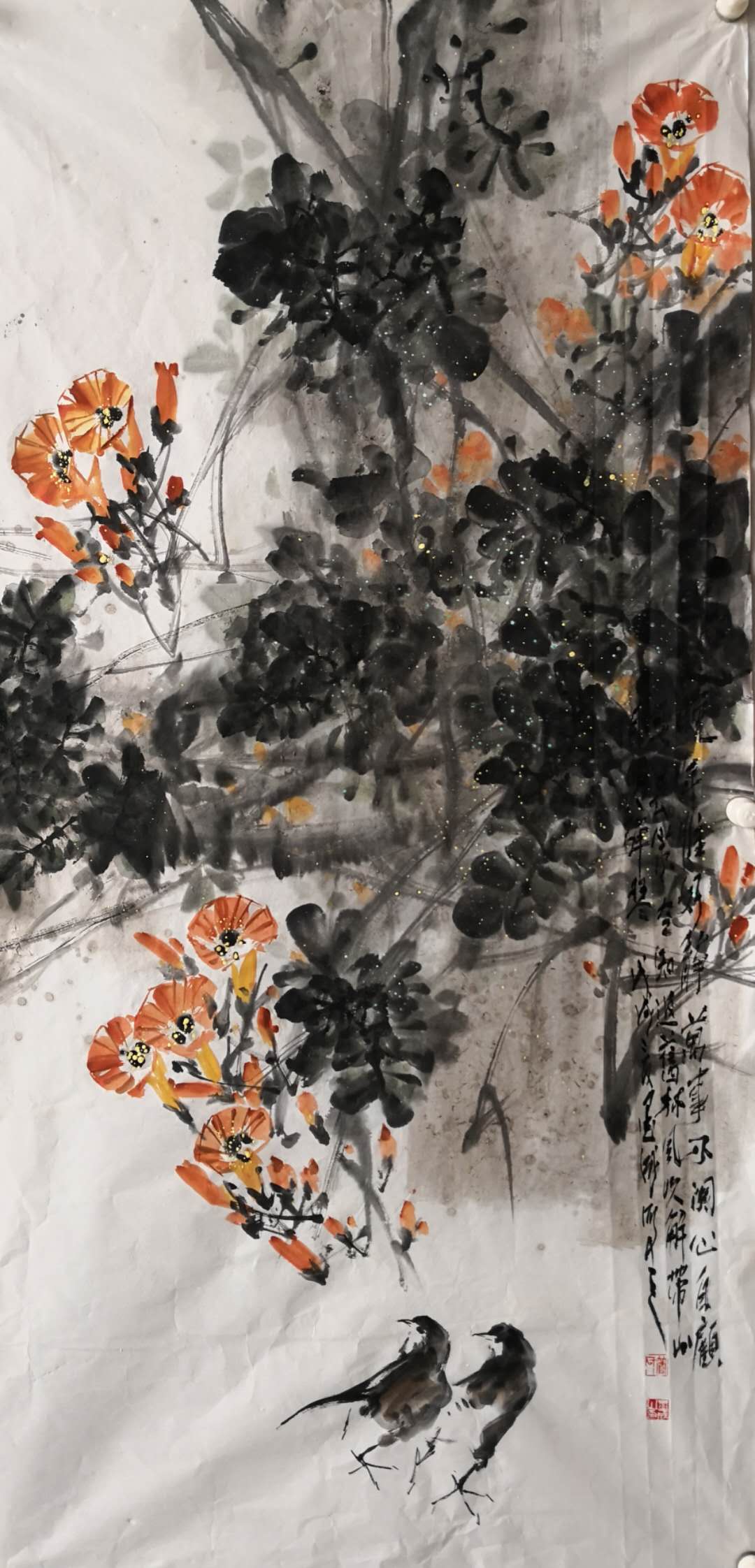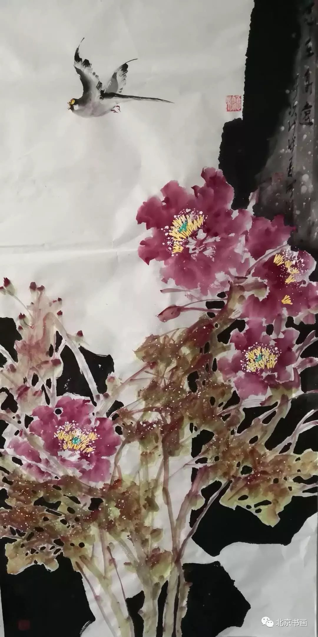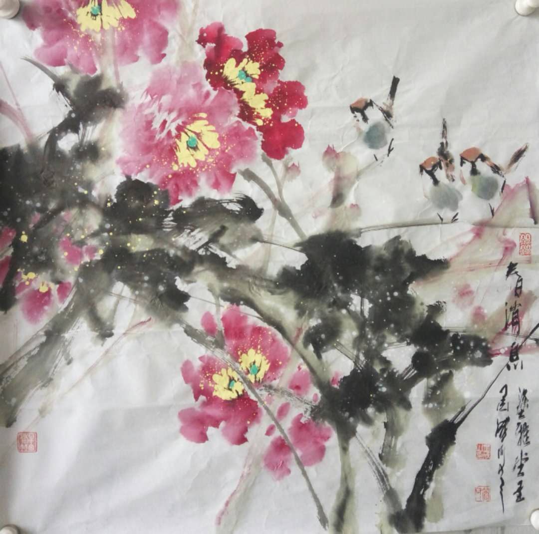 管墨成先生笔下的花鸟画注重神韵的描绘,逸笔草草不求形似。用笔用色灵活多变,画面传递出勃勃生机,观其画有一种静水深流般静谧恬淡的意境,屏气凝神,能与花对语、能与鸟合鸣。聆听花开花又落,于喧嚣红尘中,寻觅到心之淡泊宁静,恍如之神花海之中心神舒畅。作品构图巧妙疏密虚实相间,空间层次丰富,牡丹花或藏或露,或含苞待放或悄然绽放。用浓墨表现花丛下的磐石,打破传统石头的画法,表现形式新颖且具有很好的视觉效果。一对雀鸟伫立在牡丹枝上形成画眼,用笔简阔,笔墨灵动,虽寥寥数笔但形声兼备呼之欲出,可见笔墨功力之深厚。纯美画境仿佛醉了无数人缠绵的思绪,有一种浮想联翩的美感。具有文人画的意韵,极具投资收藏价值。