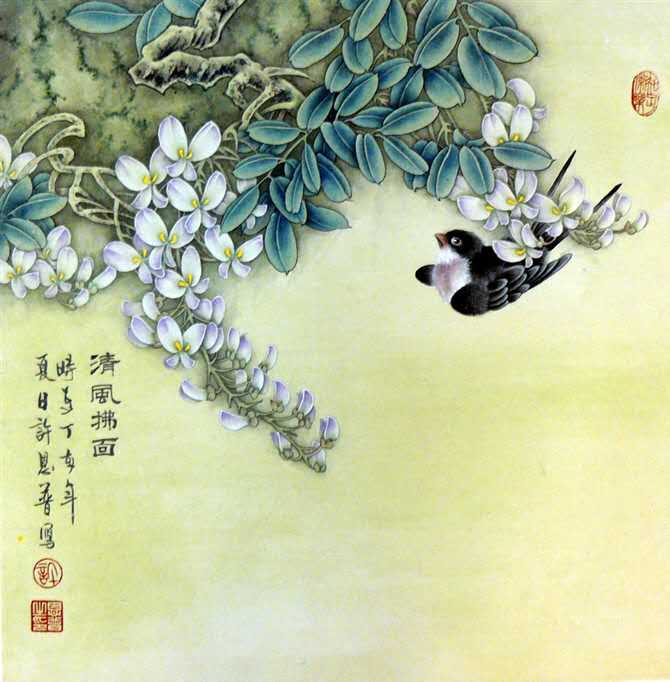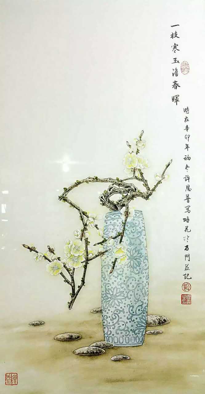 20多年以来, 许恩普充分利用业余时间, 致力于工笔花鸟画的学习, 研究与创作。他师法古今,临摹了古今名家的许多优秀作品, 精揣细摩其中蕴藏的画理和技法, 坚持以"佳者守之, 不佳者改之, 绝妙者用之, 诸家笔法可融者融之" 的学习路子, 从中广泛吸取营养, 逐步摆脱一味原版照抄"死临"的形式,不断融入自己的一些思想理念和表现技法,大胆借鉴西方画中的一些艺术处理方法,努力创造画面的和谐与统一, 渐渐地开拓出了自己的创作之路。其作品多以双勾白描,工笔重彩为主,画风严谨细致,层次分明,清逸秀丽,风格鲜明。