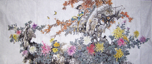 史继雨先生的花鸟画,以工谨细致的笔墨,雅洁精研的色彩,表现梅花的凌霜傲寒之风骨,牡丹的国色天香之富贵,荷花出淤泥而不染的君子之风,菊花的黄花老圃殿高秋的姿态。在花团锦簇的气象中,禽鸟翔集,具有“箫韶九成,凤皇来仪。”的吉祥文化气象。