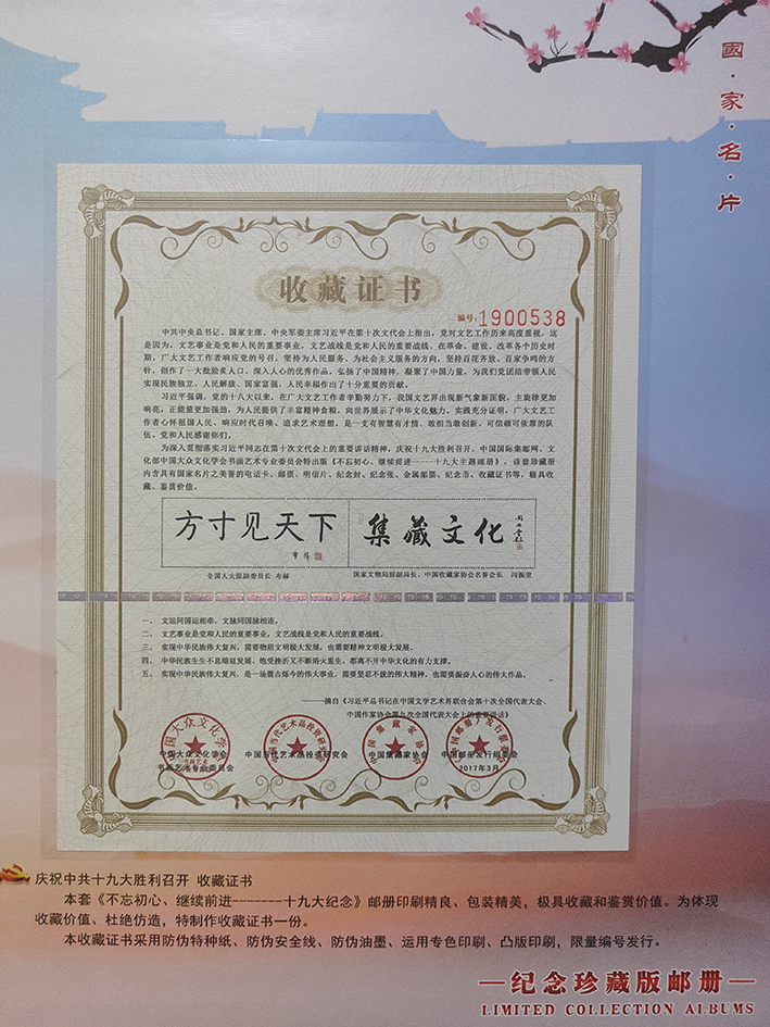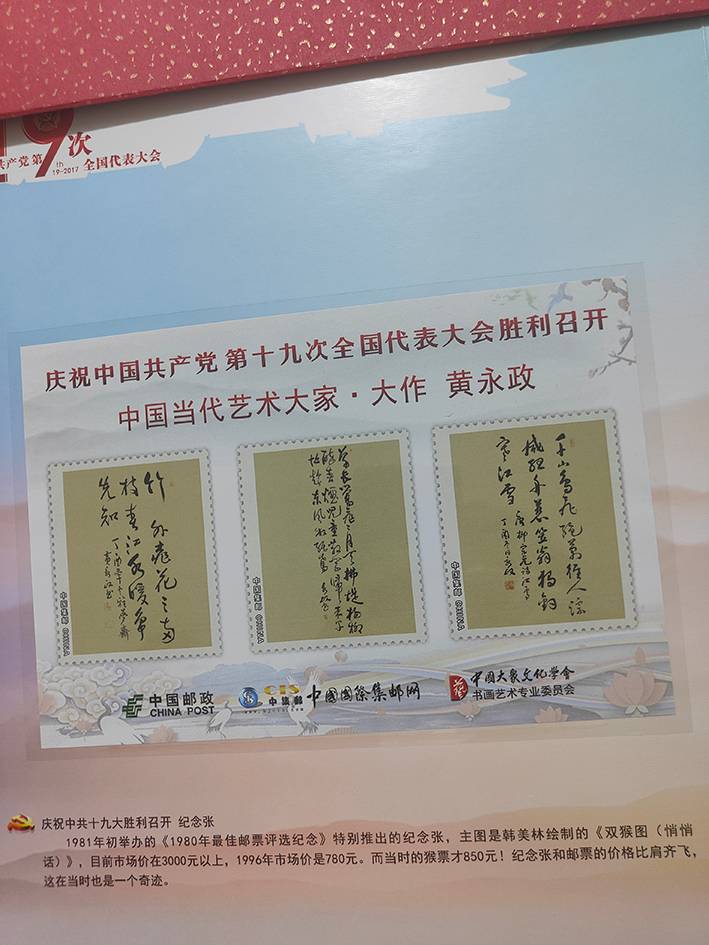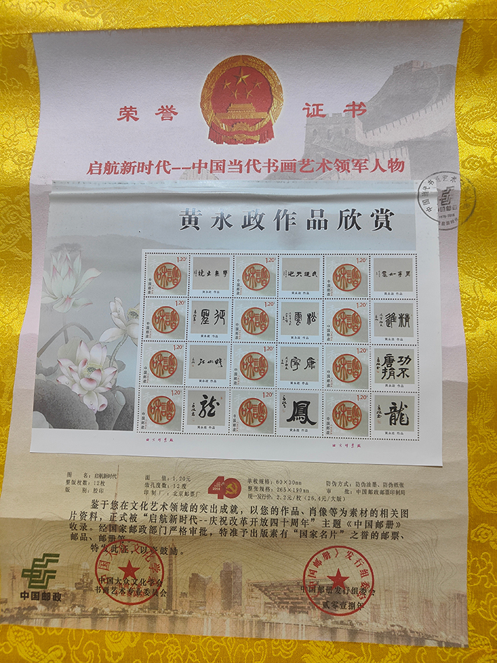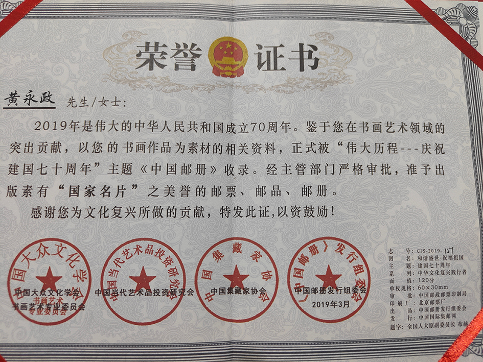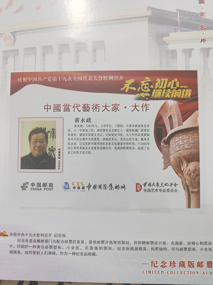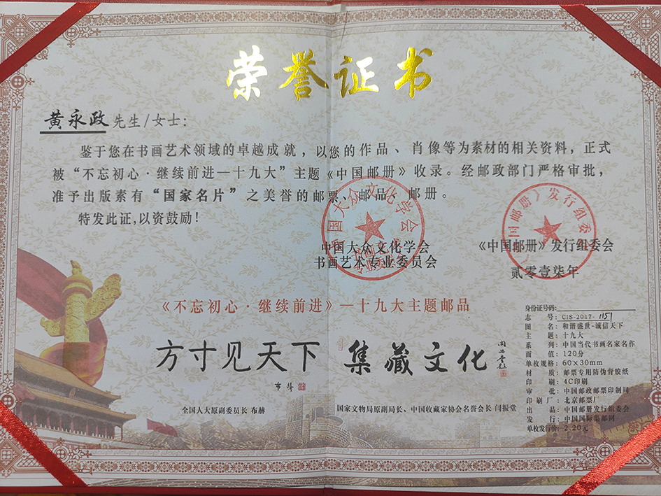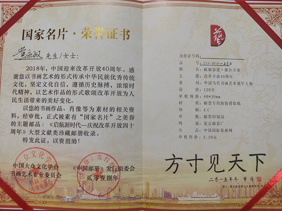 近年来,中国大众文化学会、中国邮政连续三次选用作品,为庆祝中国共产党十九次代表大会召开,庆祝改革开放四十周年,庆祝中华人民共和国成立七十周年出版书法艺术珍藏邮册。