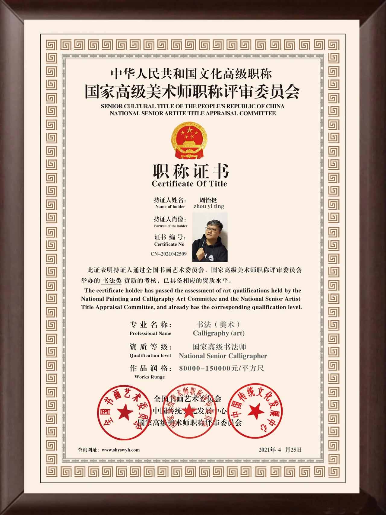 国家高级书法师,全国书画艺术委员会主席,中国收藏家协会,国际美联等等单位会员、理事。