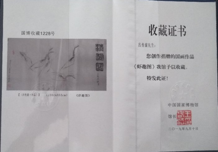 吕传康,国家一级美术师,现任中国书画家协会理事,中国书画院院士,国际中国美术家协会理事,全国才艺测评委员会理事,师承中国书画家协会主席,齐白石关门弟子刘金才入室弟子。代表作品,虾趣图,百虾图,龙之韵,清趣:中名:吕传康,国籍:中国,民族:汉,出生地:浙江,出生日期:1962年5月11曰。生平简历:浙江永康市人,现居杭州,8岁从《从介子园画传》及《自习画谱大全》等开始习画,少年顽皮,以放养虾为贴补家用,青年后到东北画玻璃画为业,1984年创办永康首家美术工艺厂,成为全国贴画大王,擅长画花鸟,虫鱼,山水人物,造型,简练,生动,所作鱼虾,天趣横生,现作品虾趣图被中国国家博物馆收藏,作品清趣图被中国书画院收藏,作品《龙之韵》流传美,曰,英,法,泰,马来西亚等国家和友人博物馆,作品百虾图入选中囯国礼,2017年因身体原因,查出肺癌中晚期,在切除半个肺.化疗四次,放疗二十五次的环境下,面对癌症折磨与之抗争,笑对人生,每天一有空余时间,坚持画画之精神,进入学习强国,现为艺术界之领导人物