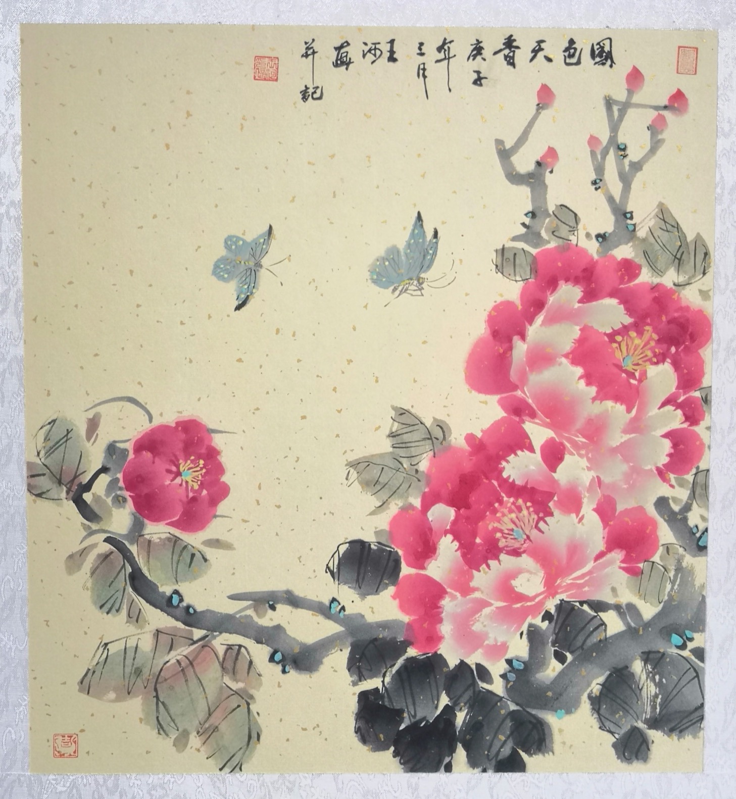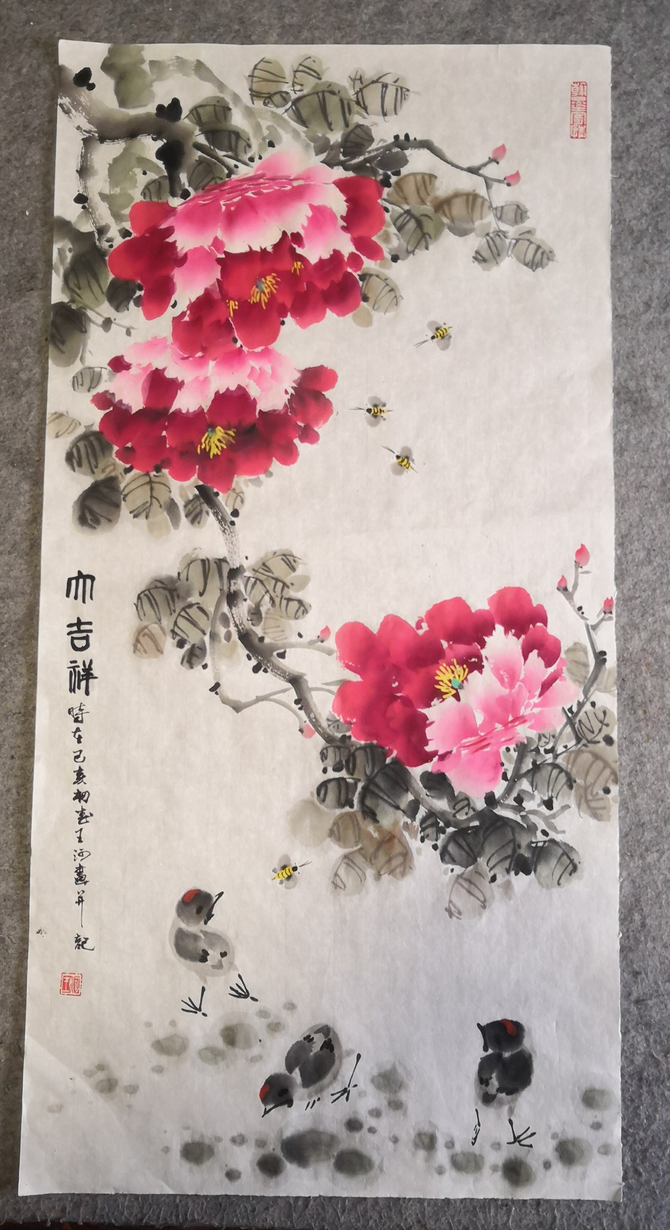 他画的牡丹其状若人;有的似生气勃勃洒脱,有的含情脉脉的似少女,形态各异,无不妙俏动情。他积累十几年来画牡丹经验,用诗句来表达更为贴切:风花瓣舞叶如蝉,晴花迎日叶挺劲,雨花下斜叶如浴,露花含抿叶羞情。所以王河先生画的牡丹,犹如与情人娓娓而谈,面对团团粉脸,含羞半掩,一擎一笑,楚楚含情,根舒叶展,阿娜多姿,一招一式,款款传情,令人如醉。他的牡丹何以生动传神?不在于形似而得之于神肖,他不是用笔与色来作画,而是用心与情来作画。用他自己的话来说,把自己的主观情感、潜移默化入客观的牡丹,简单地说,把花似人化了,不是静止的表现,而是“以动为主”。因此她笔下的牡丹花有其神态,又有神韵。
