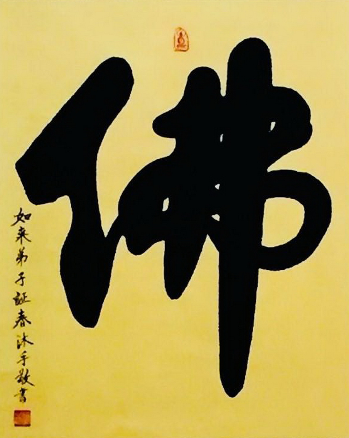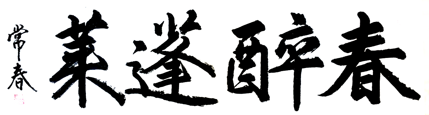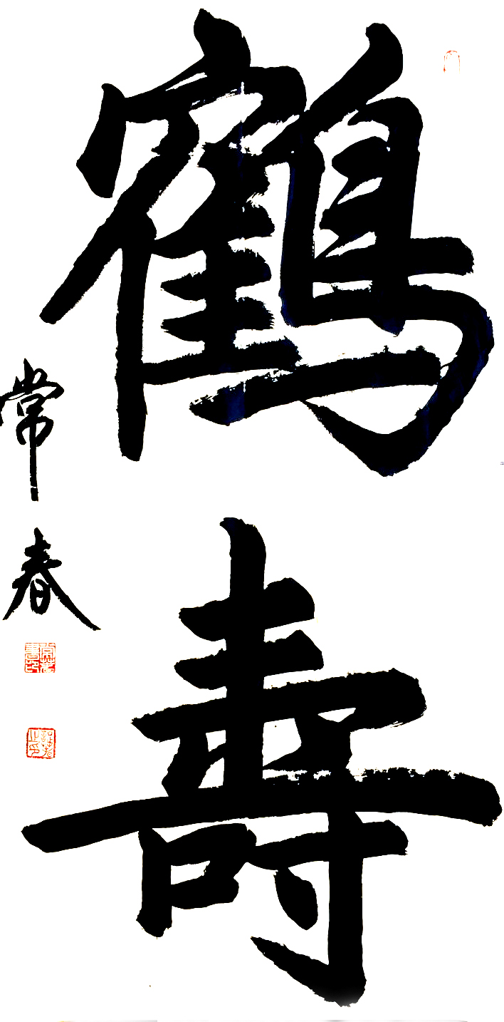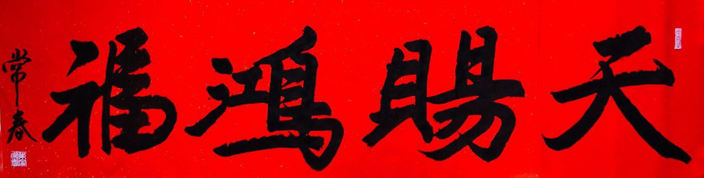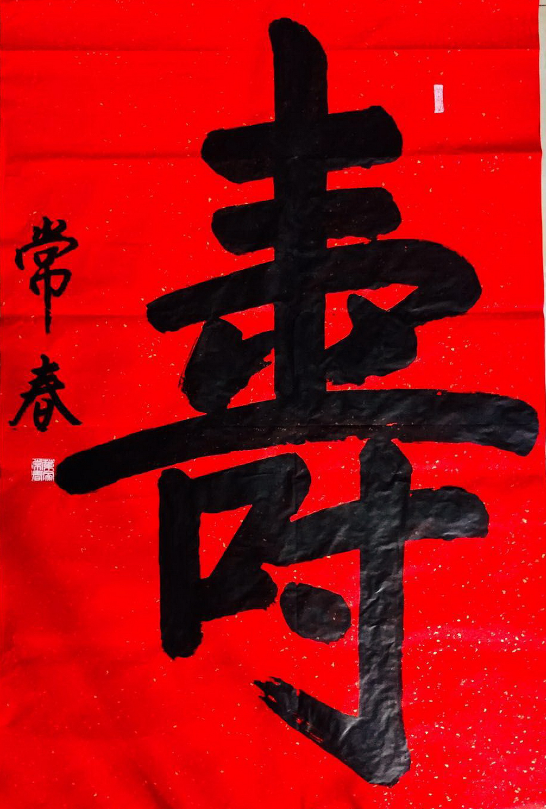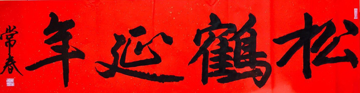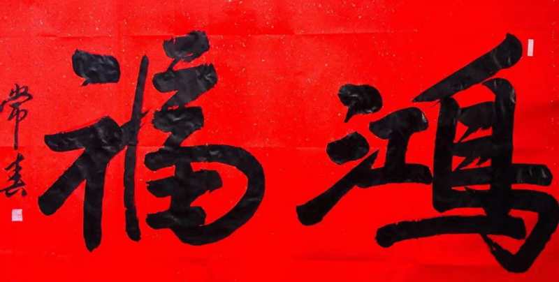 乐于挑战的叶常春向榜书艺术冲击,经过近20年孜孜不倦的潜心研习,他探索出独体榜书竖字横写的方法,解决了长期以来写大字难的要害。他的榜书一次蘸墨、一气呵成、大气磅礴、独树一帜、形神兼有,洋溢着龙虎精神。叶常春榜书喜以龙、虎、鹰、寿、鸿、福等字为内容。